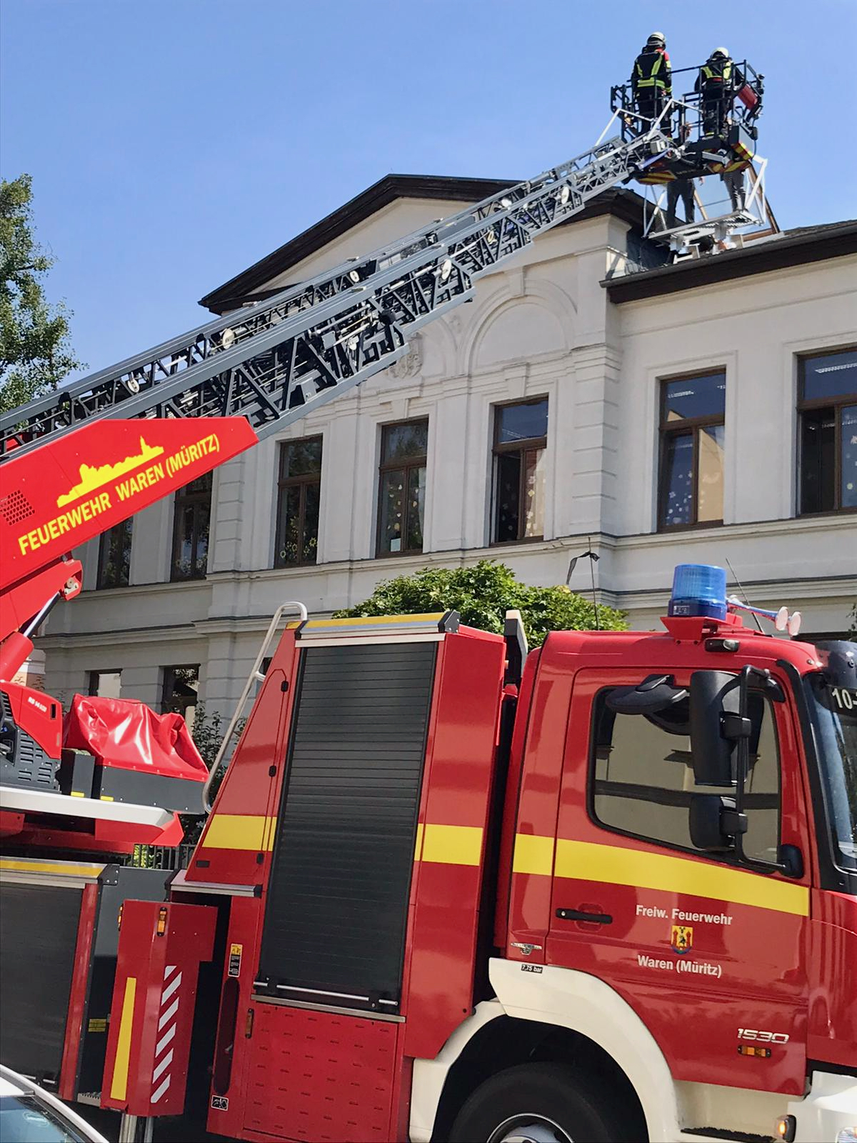 „Die Schüler haben schnell und ordentlich das Gebäude verlassen und sich zum Sammelpunkt begeben. Im Anschluss durften sie noch die Rettung über die Drehleiter beobachten. Hier haben wir den zweiten Rettungsweg aus dem Dachgeschoss getestet und eine Referendarin über diesen Weg aus dem Haus geholt“ , berichtet Warens Feuerwehrchef Reimond Kamrath.