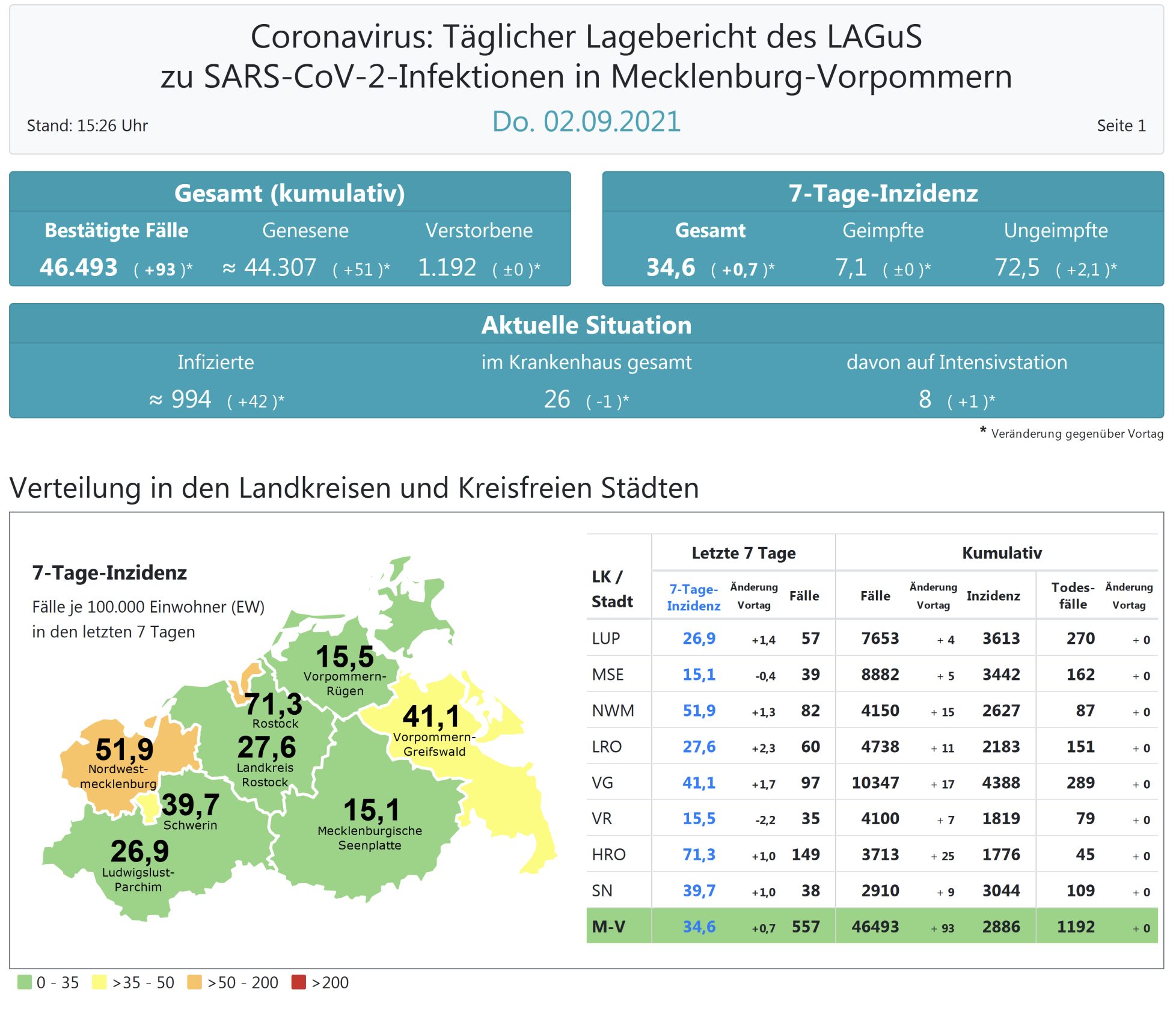 Der Inzidenzwert von ganz Mecklenburg-Vorpommern ist dagegen weiter gestiegen und liegt heute bei 34,6 (gestern 34,0). Das Land Mecklenburg-Vorpommern meldet heute 93 Neuinfektionen und keinen neuen Todesfall. Die höchste Inzidenz im Land hat die Stadt Rostock mit 710,3.