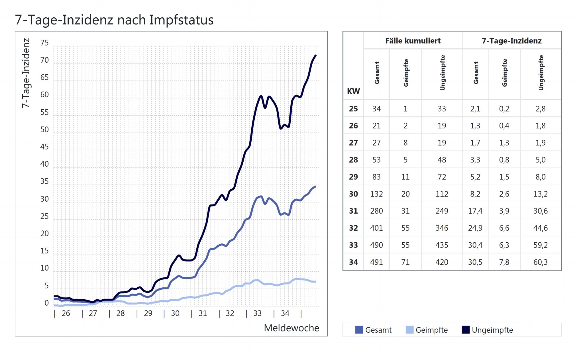 Unter diesem Artikel finden Sie, liebe Leser, nicht nur die bekannte Grafik des Landesamtes für Gesundheit zu den Corona-Fällen, sondern auch eine Grafiken zu den Inzidenzen – unterteilt in Geimpfte und Ungeimpfte.