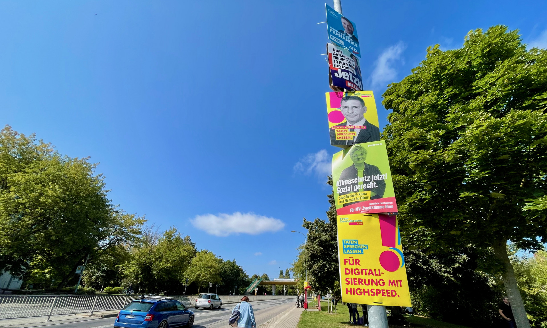 Auf die Frage, welche Aussage, die auf den Plakaten gemacht werden, denn in Erinnerung geblieben sind, kommt – nichts. Entweder, weil die Schrift viel zu klein ist und man als Autofahrer gar keine Chance hat, die Sätze zu lesen, wenn man sich auf den Verkehr konzentriert. Oder aber, weil die zumeist in knalliger Schrift hervorgehobenen Aussagen ziemlich platt sind. „Taten sprechen lassen“ heißt es da zum Beispiel. Oder „‚GemeinsamMVvoran“ oder einfach nur der Name des Kandidaten. Aha. Und anhand dieser Halbsätze oder Nicht-Sätze soll der geneigte Wähler nun entscheiden, wo er sein Kreuzchen setzt. Glaubt wirklich irgendeiner der Bewerber um einen Stuhl im Land- oder Bundestag, dass auch nur ein Wähler danach geht, wer auf ihn vom Lichtmast hinunter schaut?