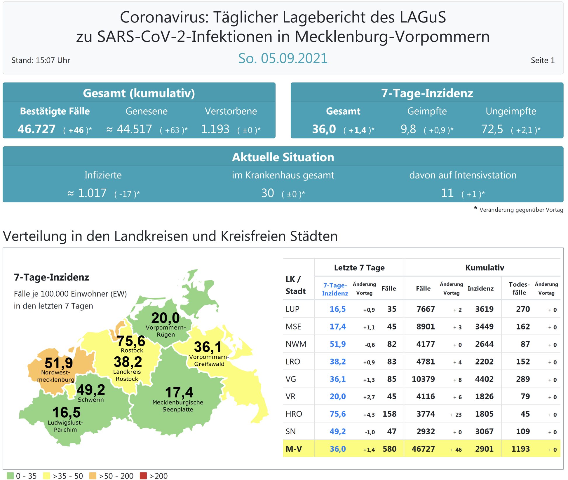 Der Inzidenzwert von ganz Mecklenburg-Vorpommern ist ebenfalls gestiegen und liegt heute bei 36,0 (gestern 34,6). Das Land Mecklenburg-Vorpommern meldet heute 46 Neuinfektionen und keinen neuen Todesfall. Die höchste Inzidenz im Land hat die Stadt Rostock mit 71,3.