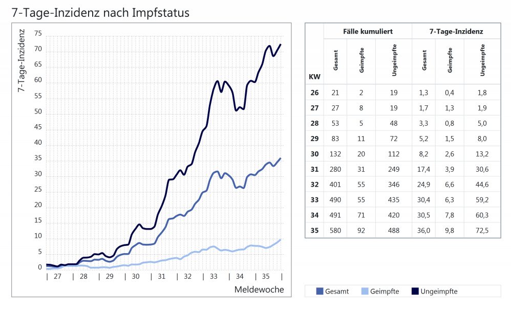 Unter diesem Artikel finden Sie, liebe Leser, nicht nur die bekannte Grafik des Landesamtes für Gesundheit zu den Corona-Fällen, sondern auch eine Grafiken zu den Inzidenzen – unterteilt in Geimpfte und Ungeimpfte.