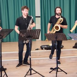 Musikstunde einmal anders: Richtig Stimmung bei den Siebtklässlern des Warener Gymnasiums. Das Saxophon Quartett „Signum“ war bei ihnen zu Gast und gestaltete einen einstündigen Workshop mit den 30 Mädchen und Jungen. Gemeinsam haben sie den Song „Happy“ von Pharell Williams erarbeitet. Die Schüler haben dazu teilweise gesungen und schließlich das Lied gemeinsam mit den Profi-Musikern präsentiert. Natürlich gab’s Gelegenheit, Fragen zu stellen, und auch Autogramme gab’s für die Schüler. Eine Musikstunde, die durch die Festspiele MV gefördert wurde und alle begeistert hat.