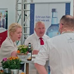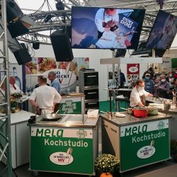 Unterdessen probierten Schul- und Kita-Kinder viele Maschinen aus, versuchten, Tiere zu streicheln oder ihr landwirtschaftliches Wissen auf den Prüfstand zu stellen. Auch Bekleidungsexperten, wie für Lederjacken und -hosen bieten ihre Produkte an, über Tiergesundheit kann debattiert werden und es gibt ein Essen-Zelt. Dort im MeLa-Kochstudio traf man auch Backhaus und Schwesig, beim Stärken.