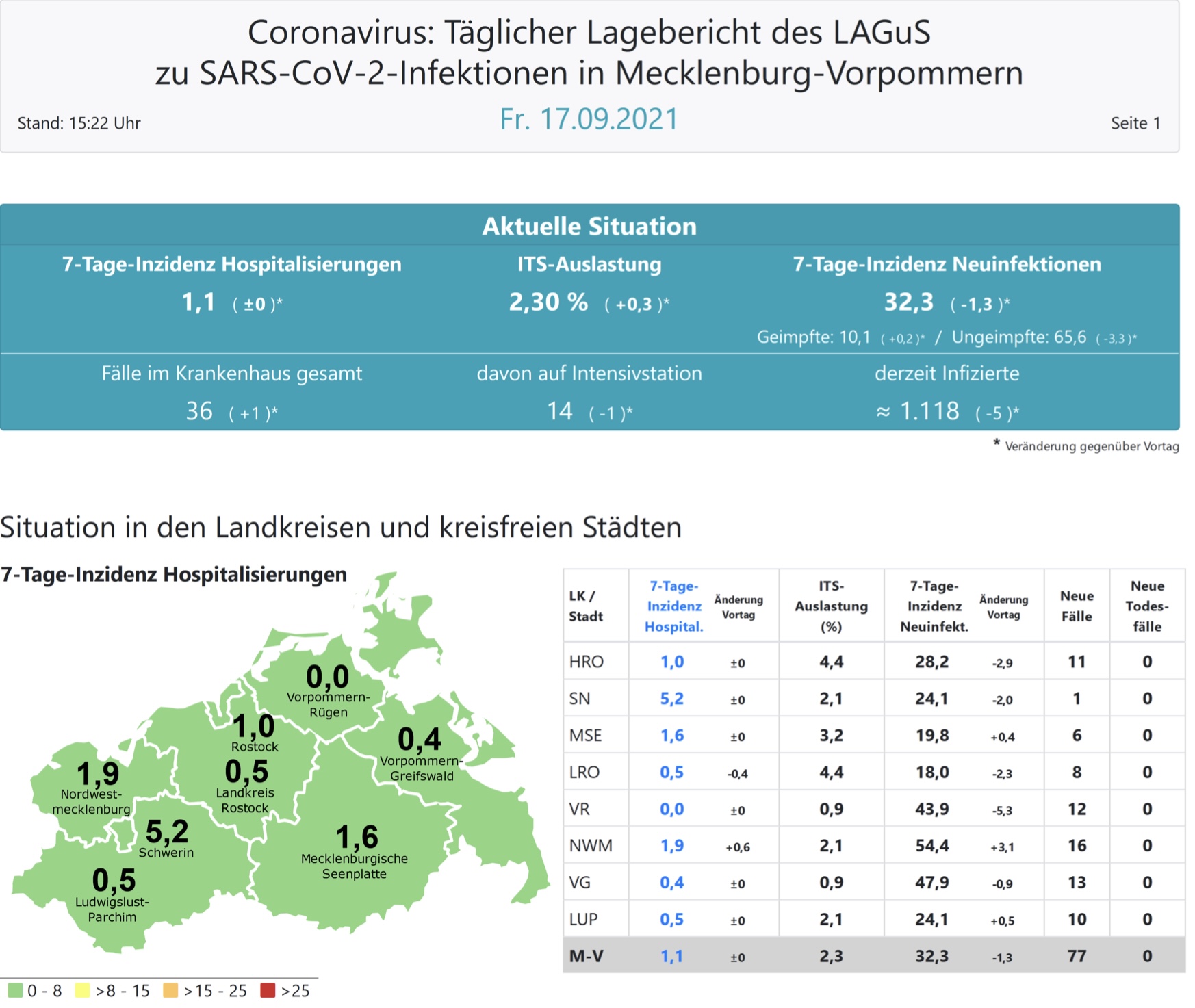 Die Hospitalisierung in ganz Mecklenburg-Vorpommern wird heute mit 1,1 angegeben. Das Land Mecklenburg-Vorpommern meldet heute 77 Neuinfektionen und keinen neuen Todesfall. Den höchsten Hospitalisierungswert hat die Stadt Schwerin mit 5,2.