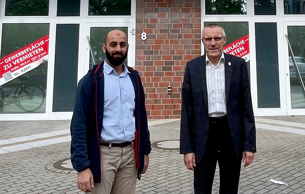 Foto oben: Warens Bürgermeister Norbert Möller und der Augenarzt Marwan Al-Ithawi vor den künftigen Praxisräumen am Amtsbrink