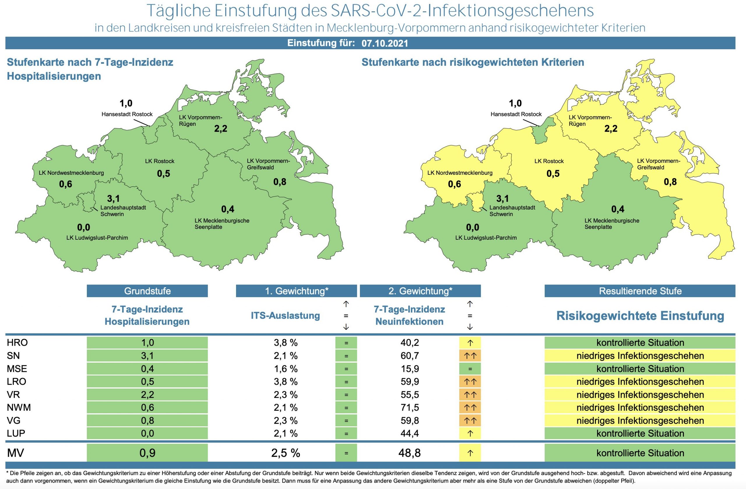 Die Hospitalisierung in ganz Mecklenburg-Vorpommern ist etwas gestiegen und wird heute mit 0,9 (gestern 0,8), die Inzidenz des Landes ist etwas gestiegen und liegt bei 48,8 (gestern 47,0). Das Land Mecklenburg-Vorpommern meldet heute 173 Neuinfektionen und zwei neue Todesfälle.