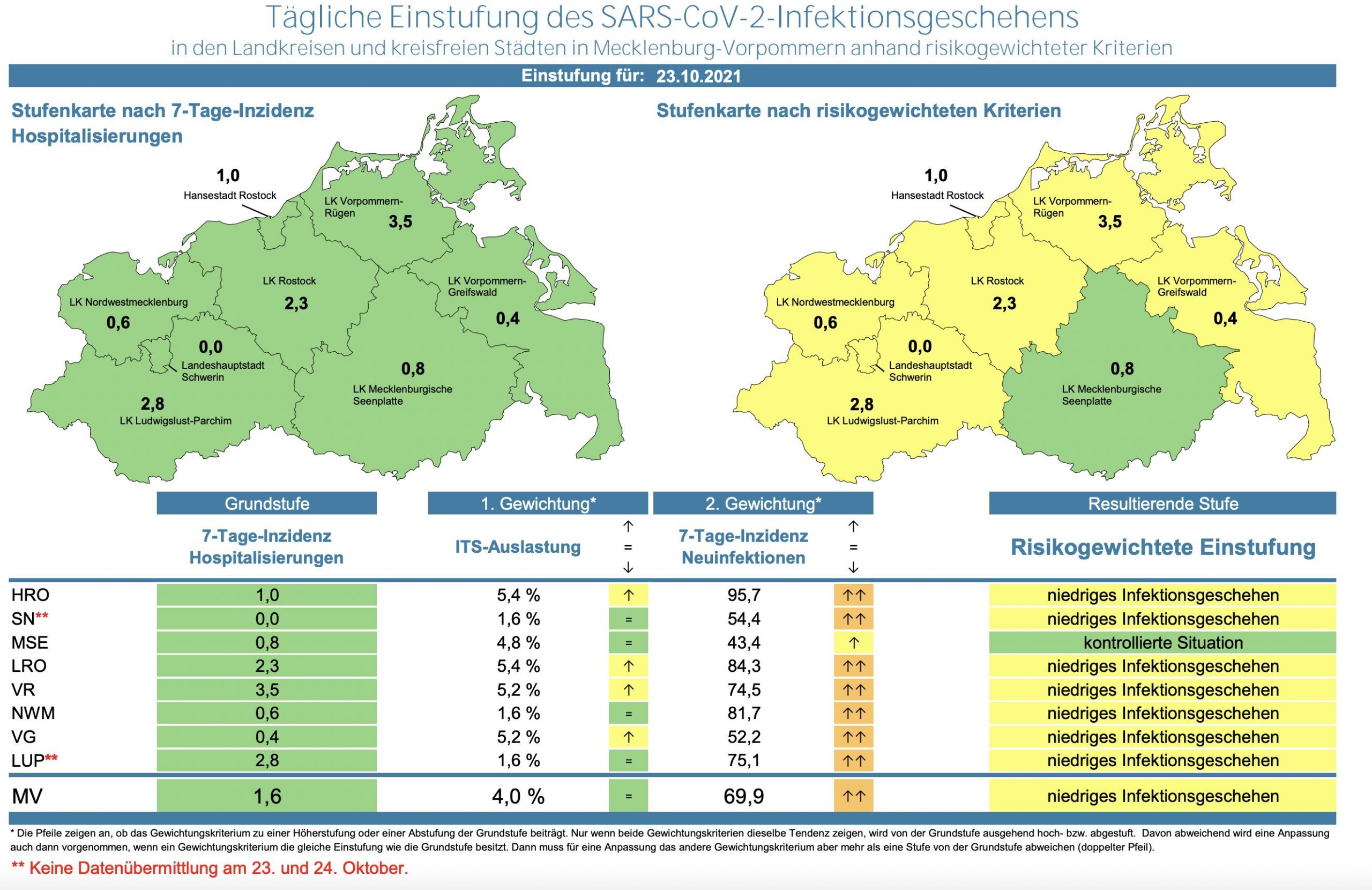 Die Hospitalisierung in ganz Mecklenburg-Vorpommern ist gesunken und liegt heute bei 1,6 (gestern 1,8 ). Die Inzidenz des Landes ist leicht gesunken und liegt bei 69,9 (gestern 70,2). Das Land Mecklenburg-Vorpommern meldet heute 101 Neuinfektionen und keinen neuen Todesfall.