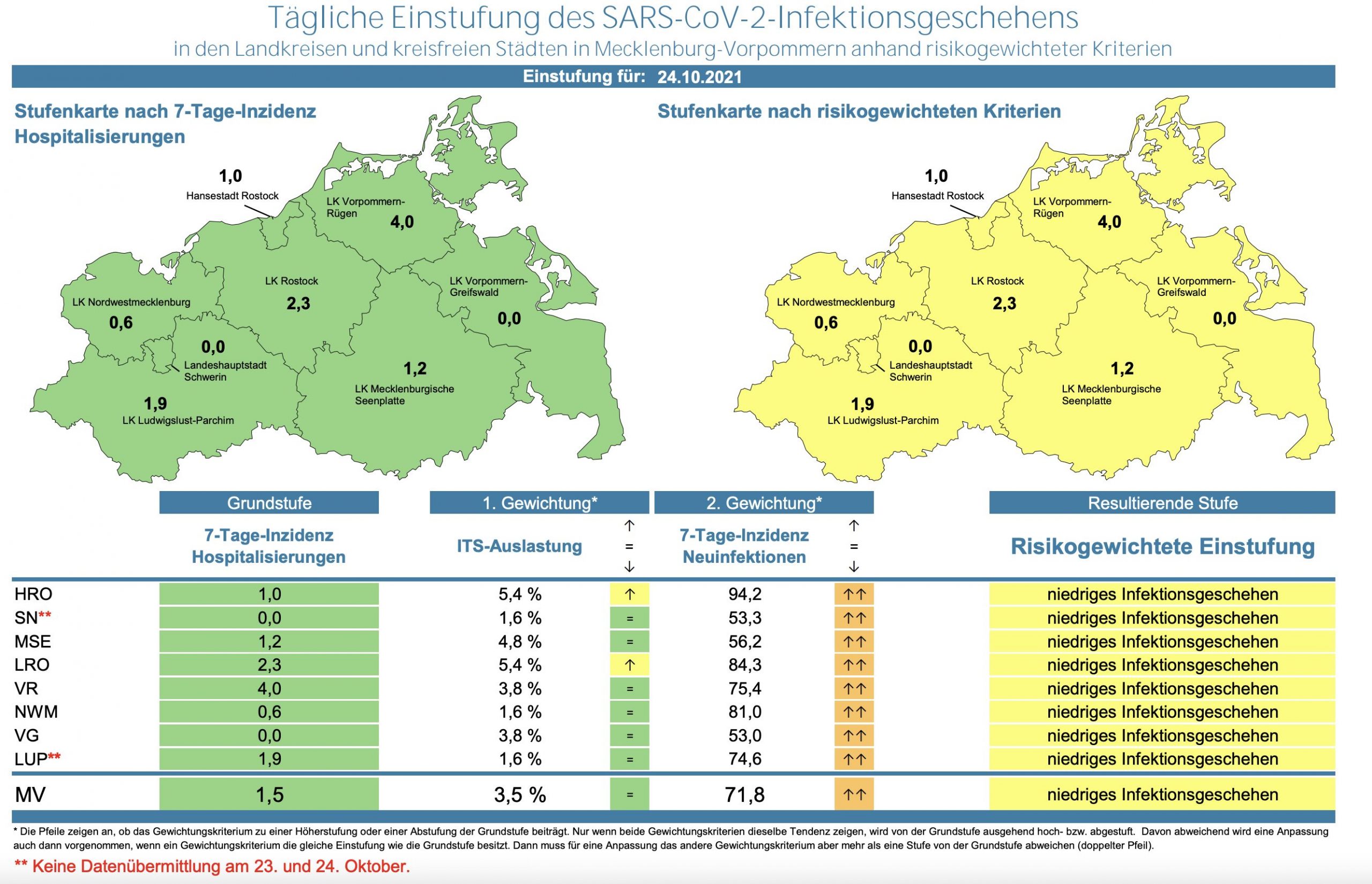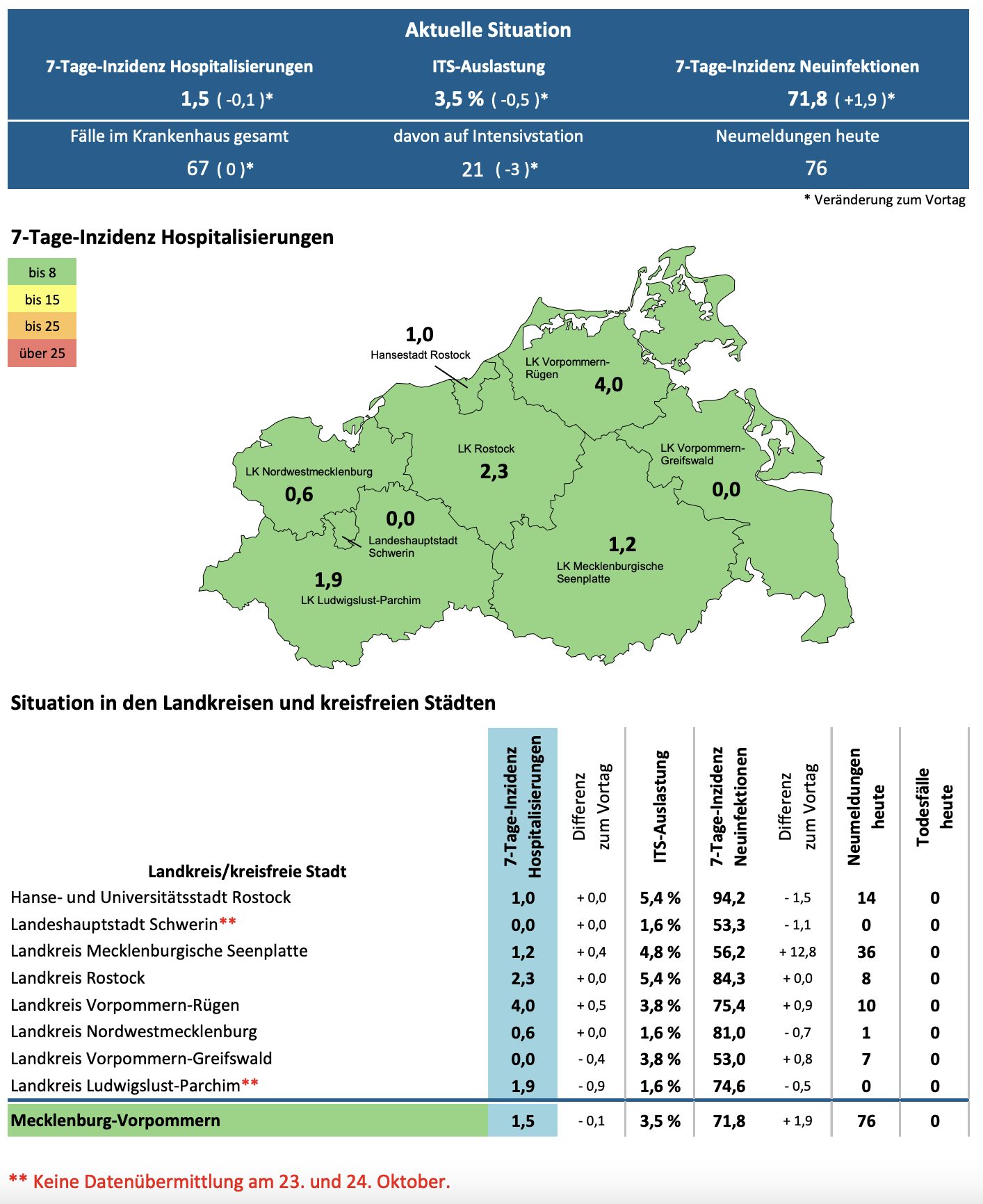 Die Hospitalisierung in ganz Mecklenburg-Vorpommern ist leicht gesunken und liegt heute bei 1,6 (gestern 1,5 ). Die Inzidenz des Landes ist gestiegen und liegt bei 71,8 (gestern 69,9). Das Land Mecklenburg-Vorpommern meldet heute 76 Neuinfektionen und keinen neuen Todesfall.