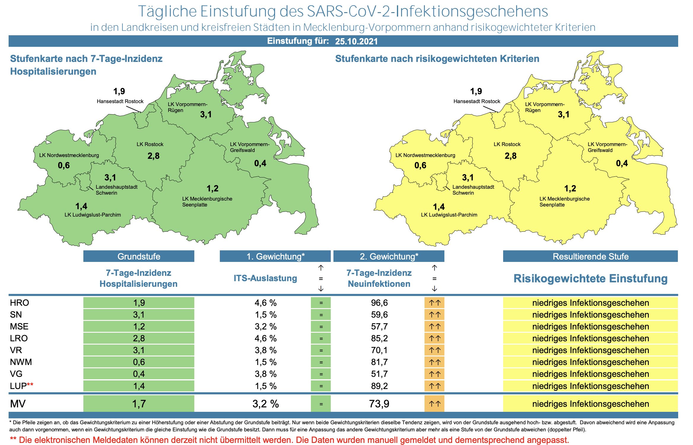 Die Hospitalisierung in ganz Mecklenburg-Vorpommern ist leicht gestiegen und liegt heute bei 1,7 (gestern 1,6 ). Die Inzidenz des Landes ist ebenfalls gestiegen und liegt bei 73,9 (gestern 71,8). Das Land Mecklenburg-Vorpommern meldet heute 94Neuinfektionen und sechs neue Todesfälle.