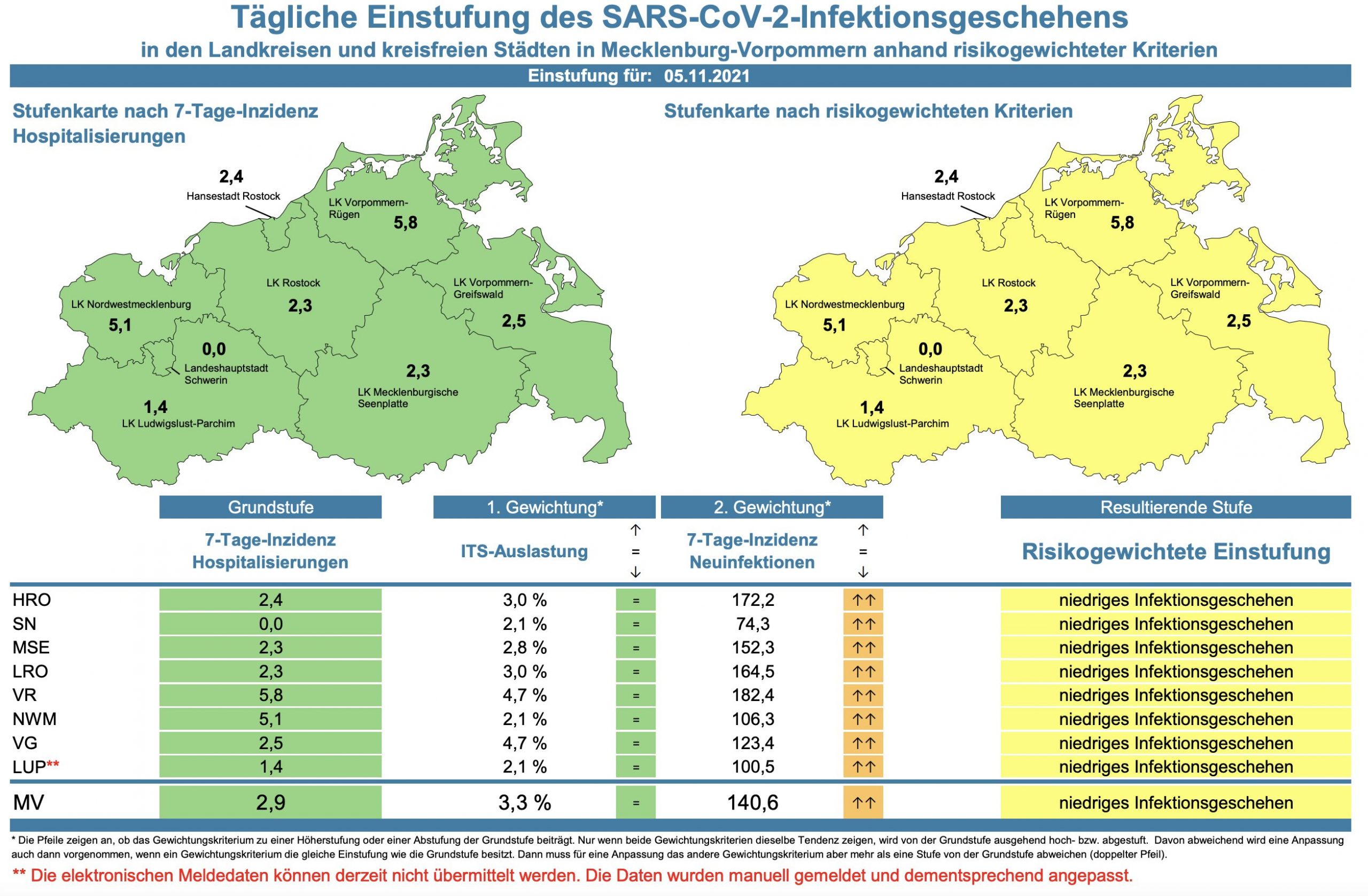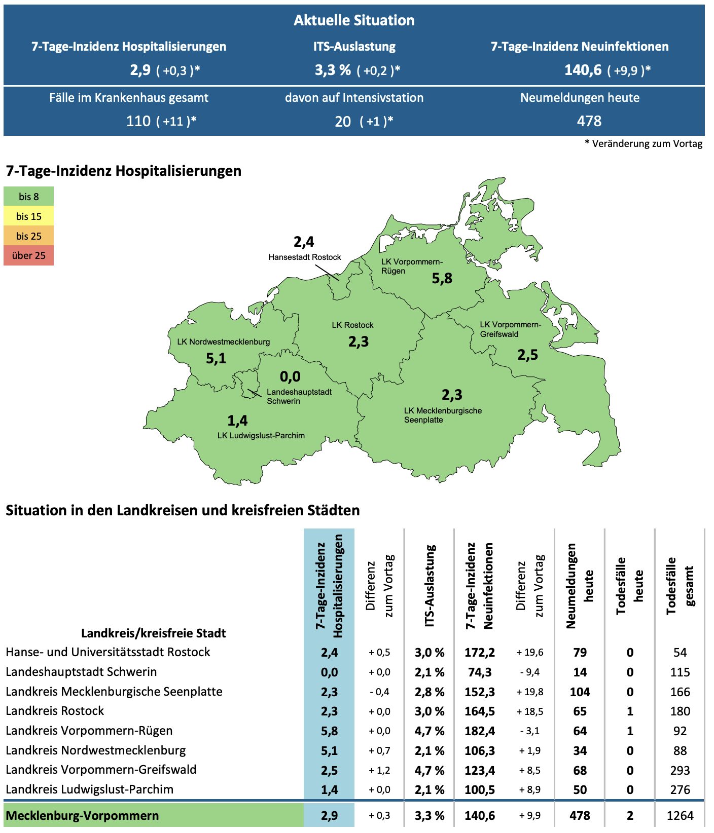 Die Hospitalisierung in ganz Mecklenburg-Vorpommern ist von 2,6 auf 2,9 gestiegen. Die Inzidenz des Landes stieg von 130,7 auf 140,6. Das Land Mecklenburg-Vorpommern meldet heute 478 Neuinfektionen und zwei neue Todesfälle.