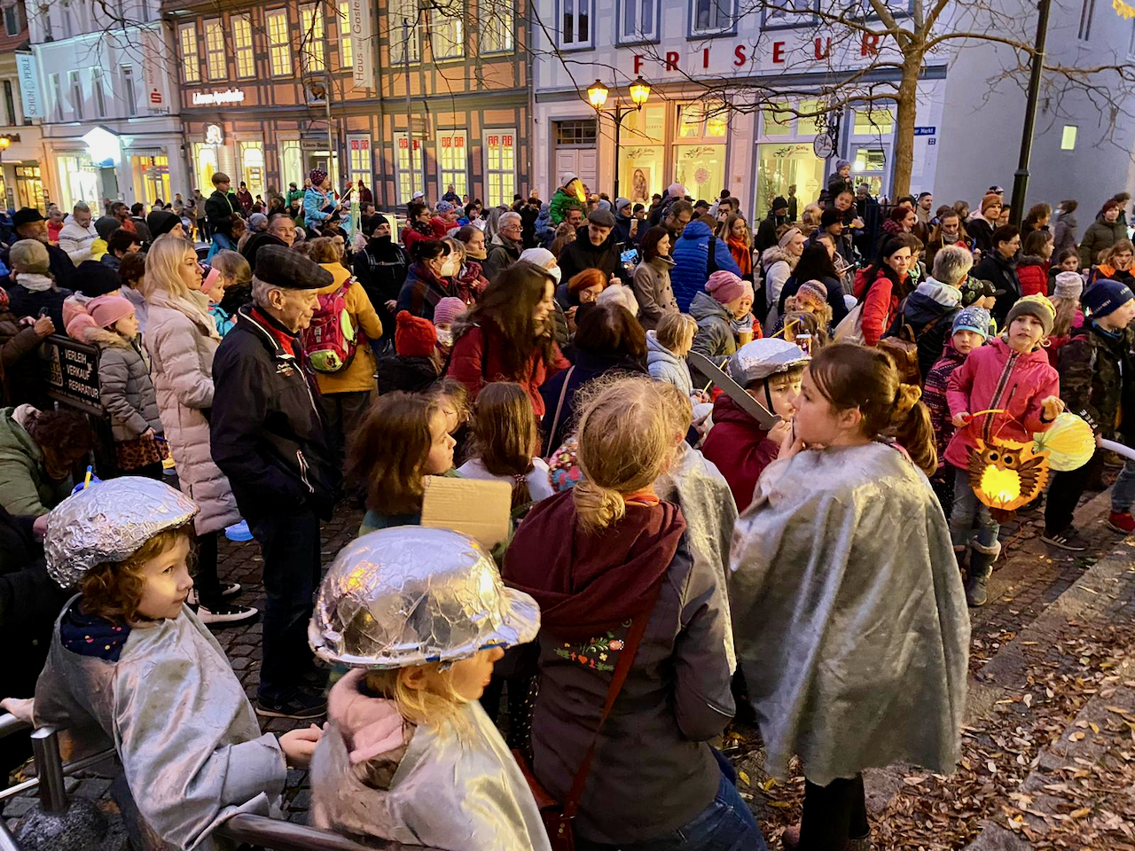 Anders als geplant, ging es in Anbetracht der hohen Corona-Zahlen aber nicht auf den Hof der katholischen Gemeinde in die Kietzstraße, die Hörnchen wurden auf dem großen Platz vor dem Müritzeum geteilt. Den vielen Kindern hat’s trotzdem gefallen.