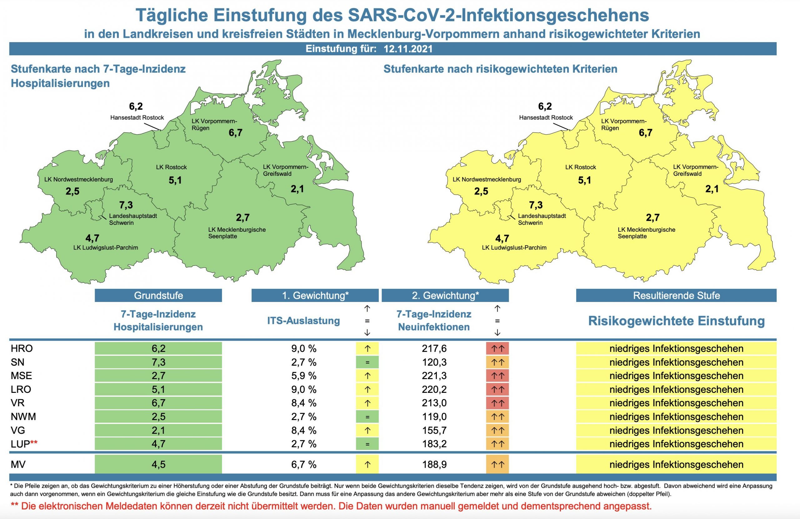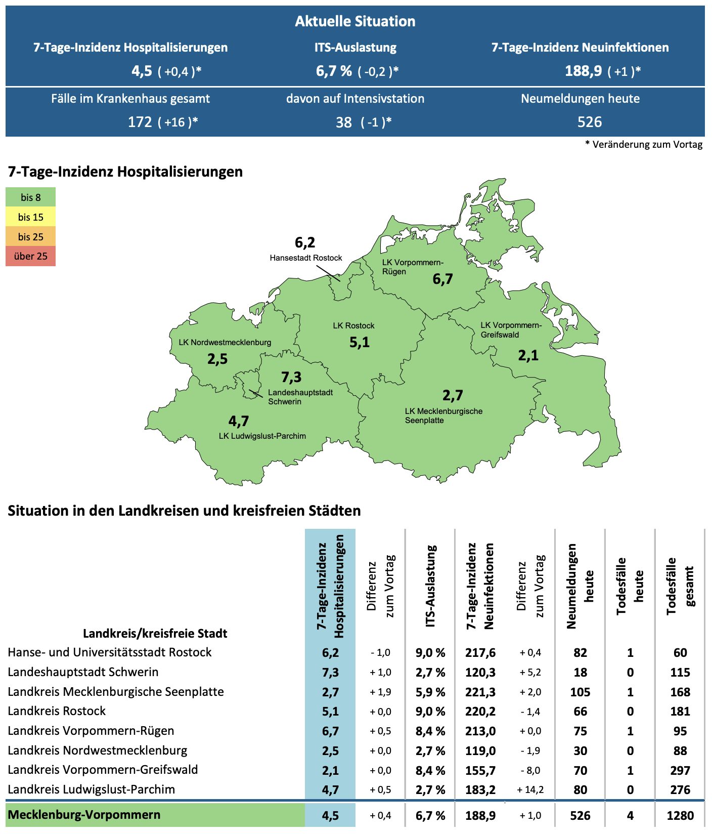 Die Hospitalisierung in ganz Mecklenburg-Vorpommern ist von 4,2 auf 4,5 gestiegen. Die Inzidenz des Landes steigt von 187,9 auf 188,9. Das Land Mecklenburg-Vorpommern meldet heute mit 526Neuinfektionen und 4 neue Todesfälle.