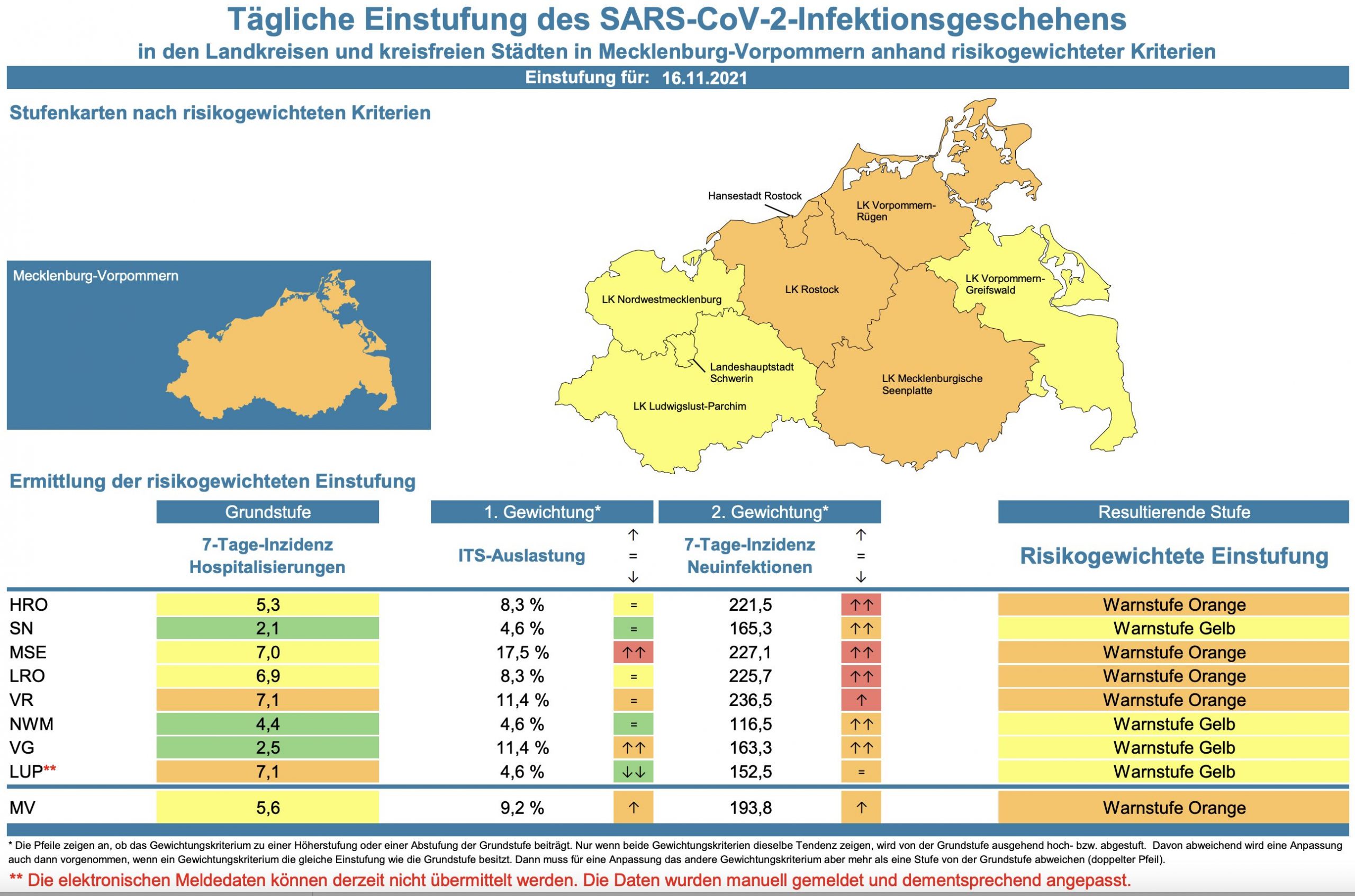 Die Hospitalisierung in ganz Mecklenburg-Vorpommern wird heute mit 5,6 angegeben (gestern 4,8). Die Inzidenz des Landes sinkt von 207,8 auf 193,8. Das Land Mecklenburg-Vorpommern meldet heute mit 774 Neuinfektionen – so viele wie noch nie – und drei neue Todesfälle.