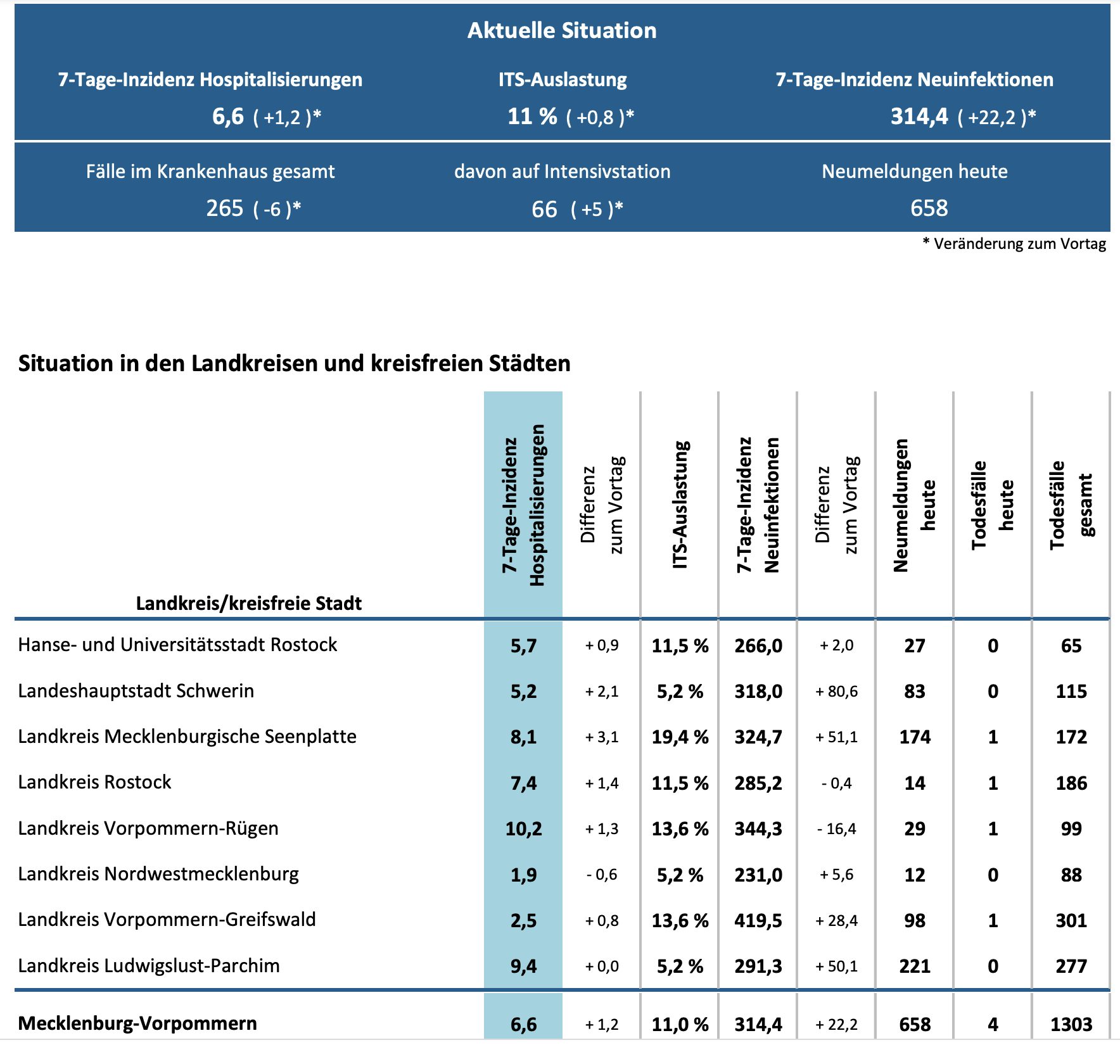 Die Hospitalisierung in ganz Mecklenburg-Vorpommern wird heute mit 6,6 angegeben (gestern 5,4). Die Inzidenz des Landes steigt von 292,2 auf 314,4. Das Land Mecklenburg-Vorpommern meldet heute 658 Neuinfektionen und vier neue Todesfälle.