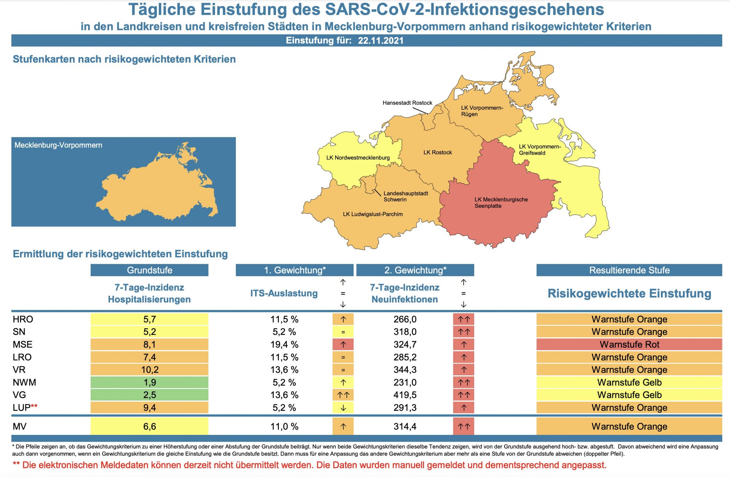 Der Landkreis Mecklenburgische Seenplatte ist derzeit der einzige in MV, der auf der risikogewichteten Stufenkarte auf „rot“ steht. Drei weitere – Vorpommern-Rügen, Rostock, Ludwigslust-Parchim – und die Stadt Schwerin stehen auf orange. Bleibt der Landkreis drei Tage hintereinander „rot“, werden die Corona-Maßnahmen noch einmal verschärft.