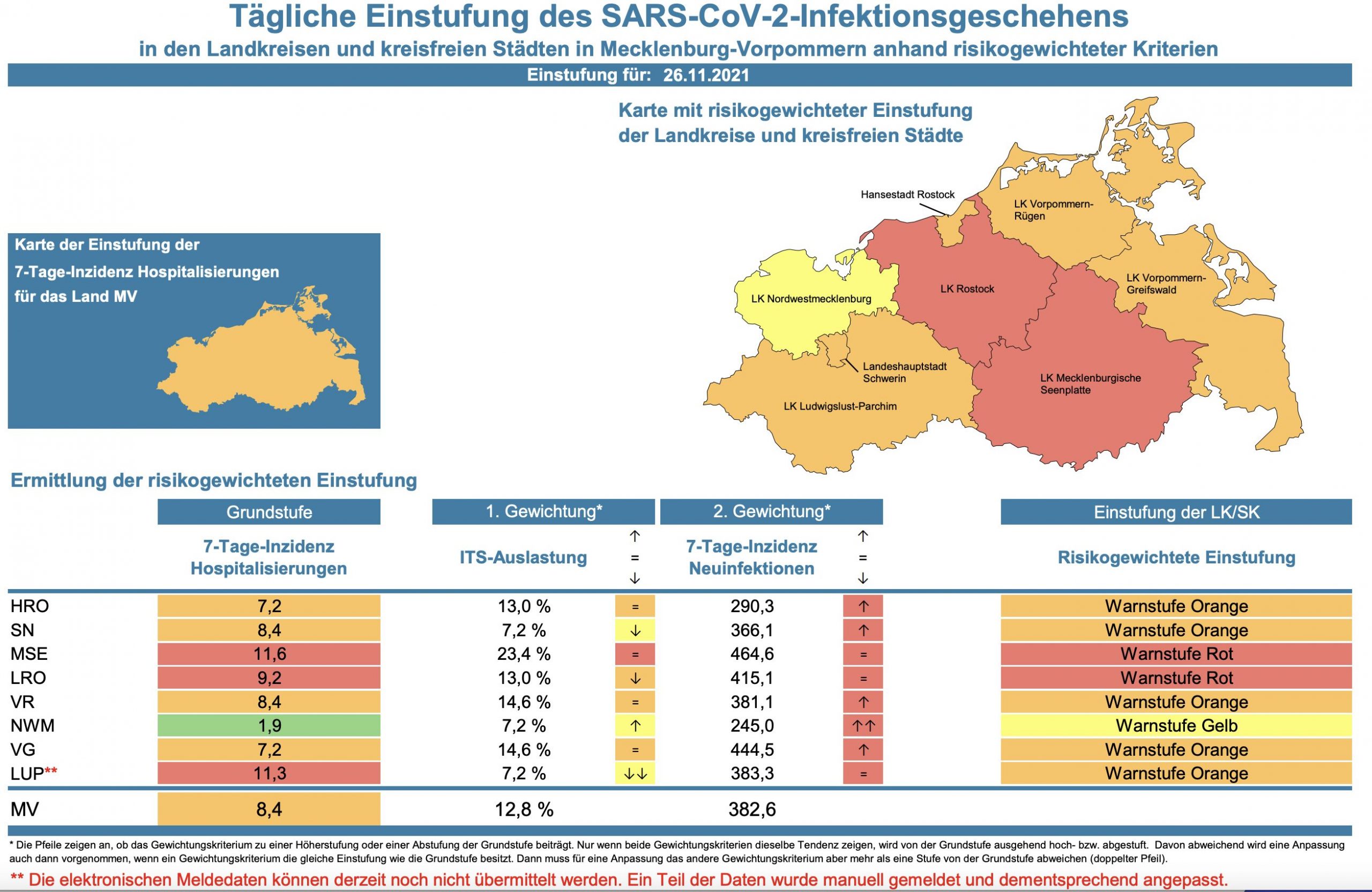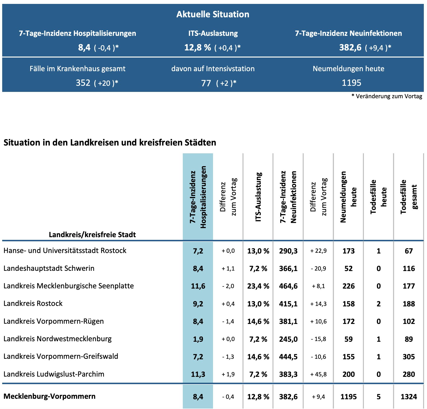 Die Hospitalisierung in ganz Mecklenburg-Vorpommern wird heute mit 8,4 angegeben (gestern 8,8). Die Inzidenz des Landes steigt von 373,2 auf 382,6. Das Land Mecklenburg-Vorpommern meldet heute 1195 Neuinfektionen und fünf neue Todesfälle.