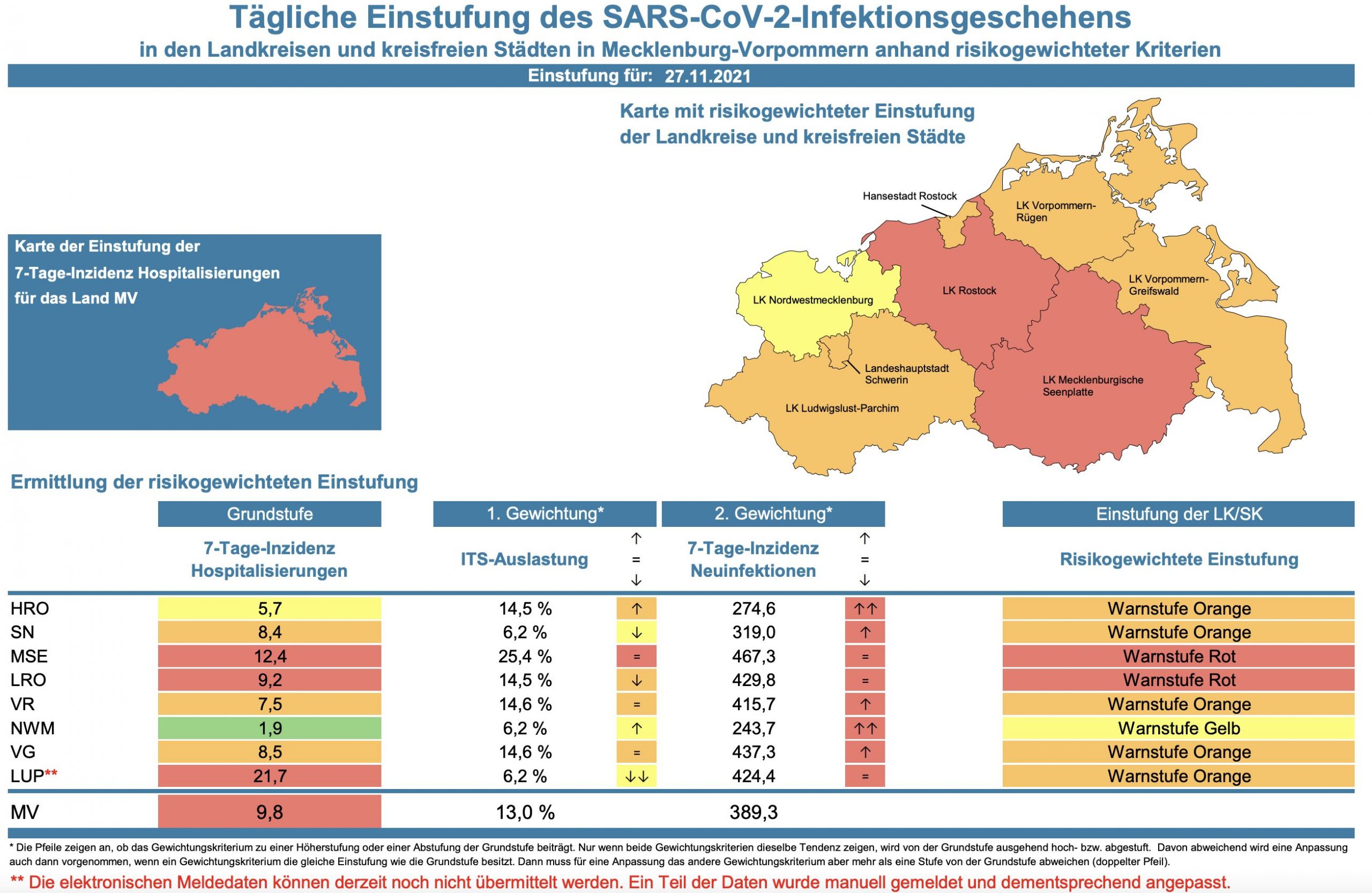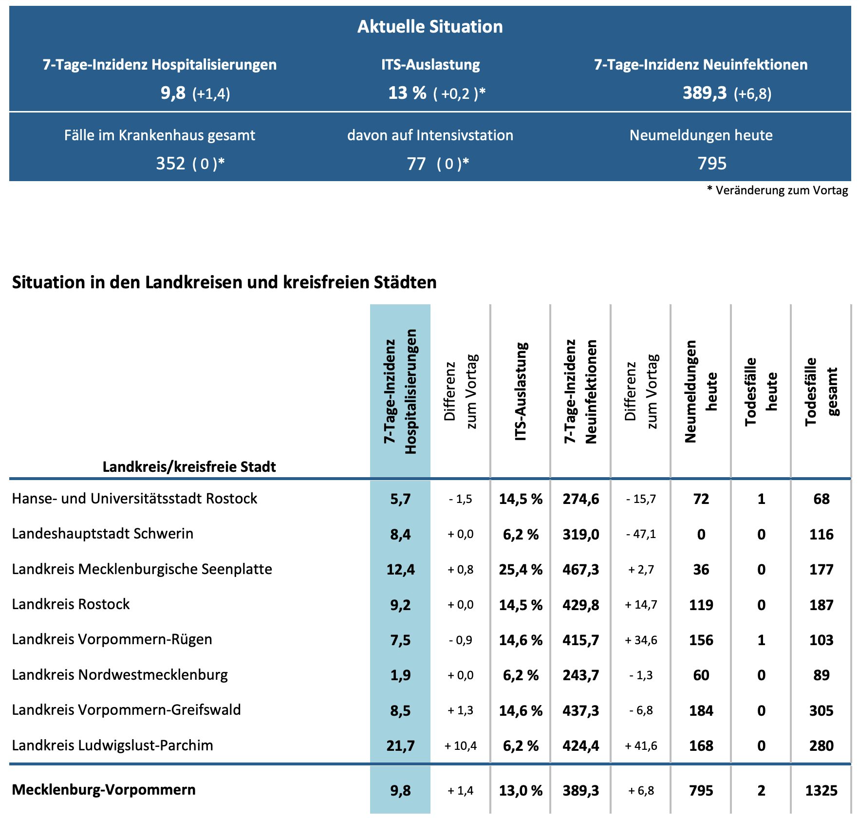 Die Hospitalisierung in ganz Mecklenburg-Vorpommern wird heute mit 9,8 angegeben (gestern 8,4). Die Inzidenz des Landes steigt von 382,6 auf 389,3. Das Land Mecklenburg-Vorpommern meldet heute 795 Neuinfektionen und zwei neue Todesfälle.