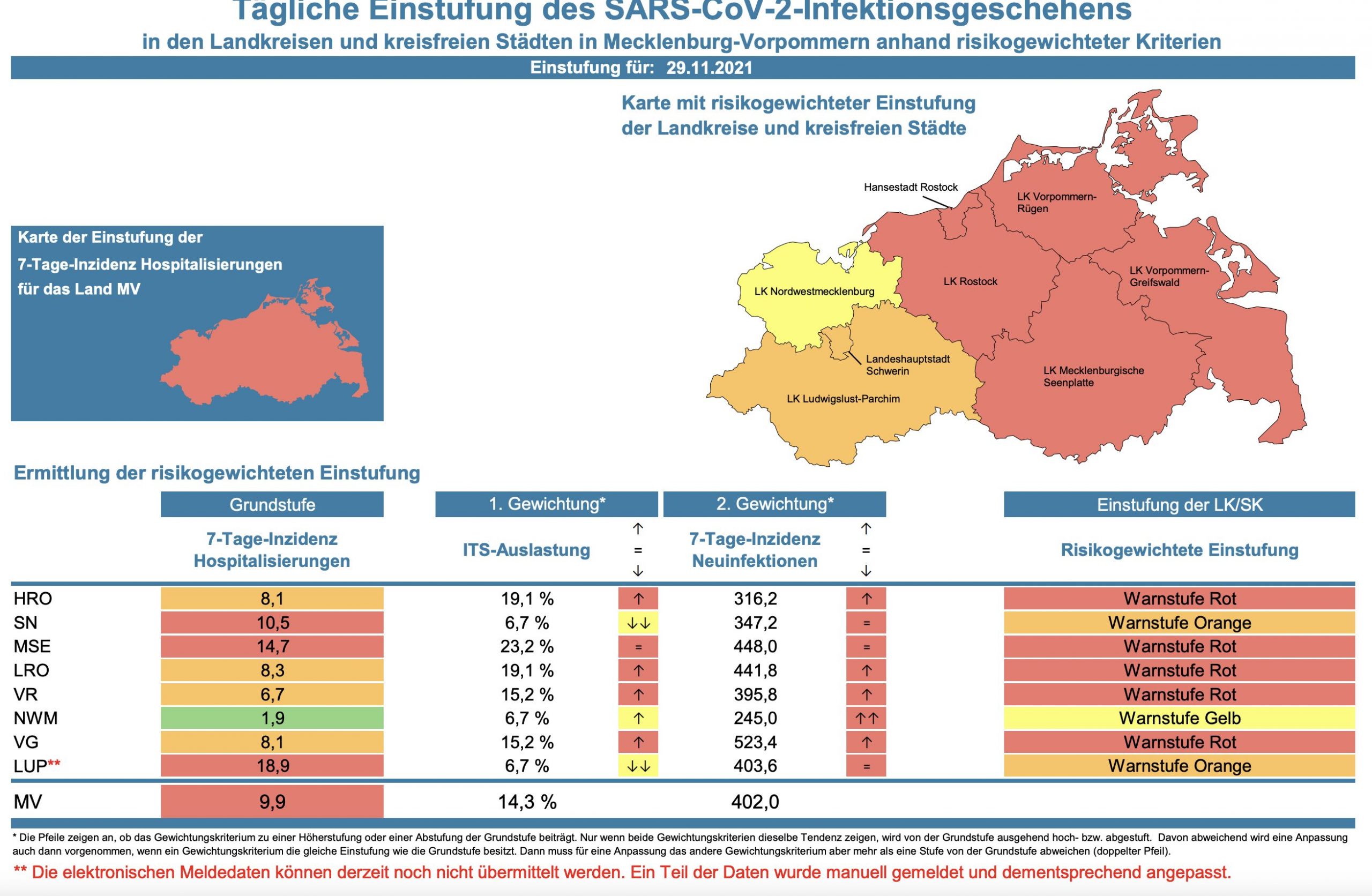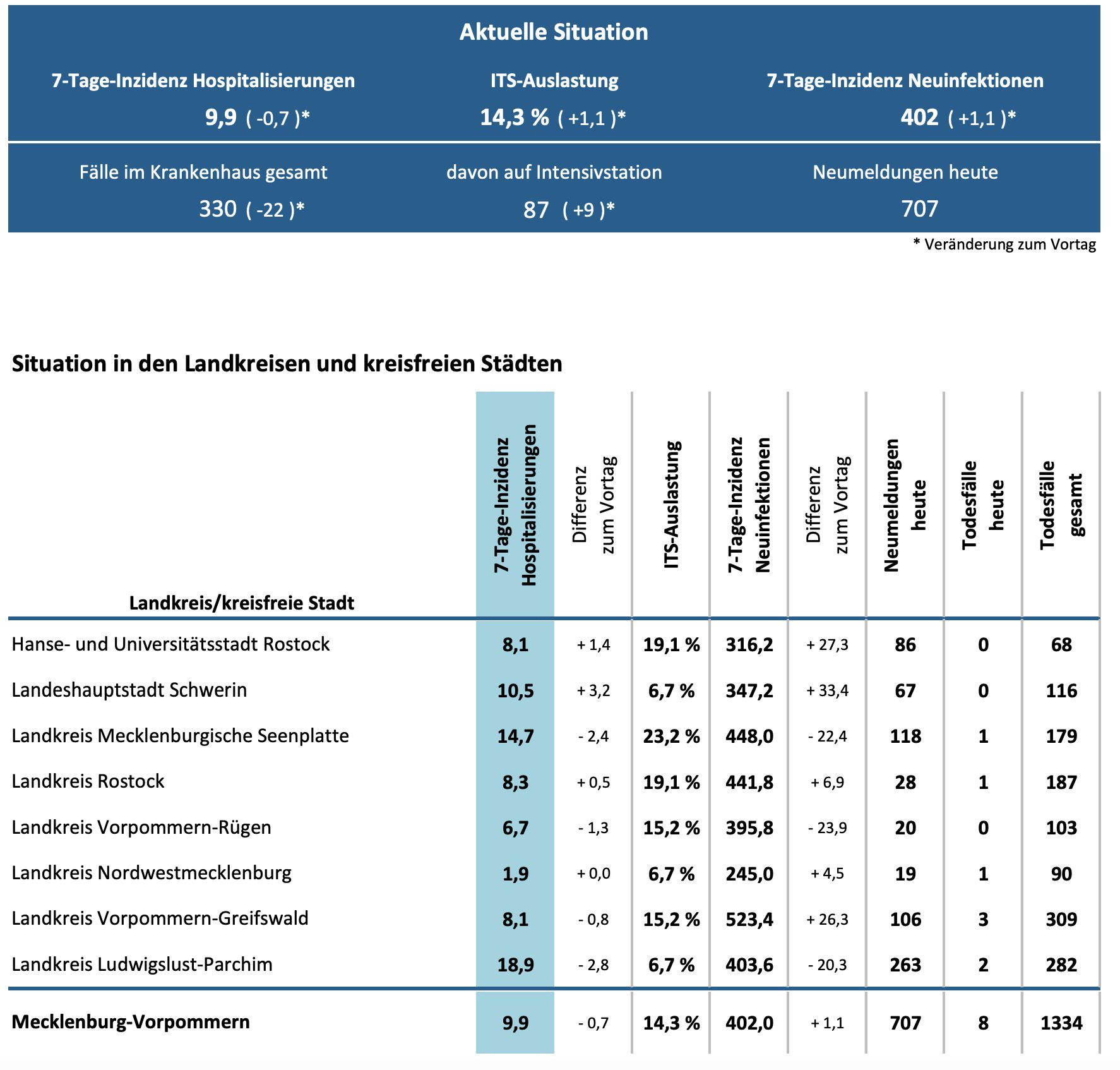 Die Hospitalisierung in ganz Mecklenburg-Vorpommern wird heute mit 9,9 angegeben (gestern 10,6). Die Inzidenz des Landes steigt von 400,9 auf 402,0. Das Land Mecklenburg-Vorpommern meldet heute 707 Neuinfektionen und acht neue Todesfälle.
