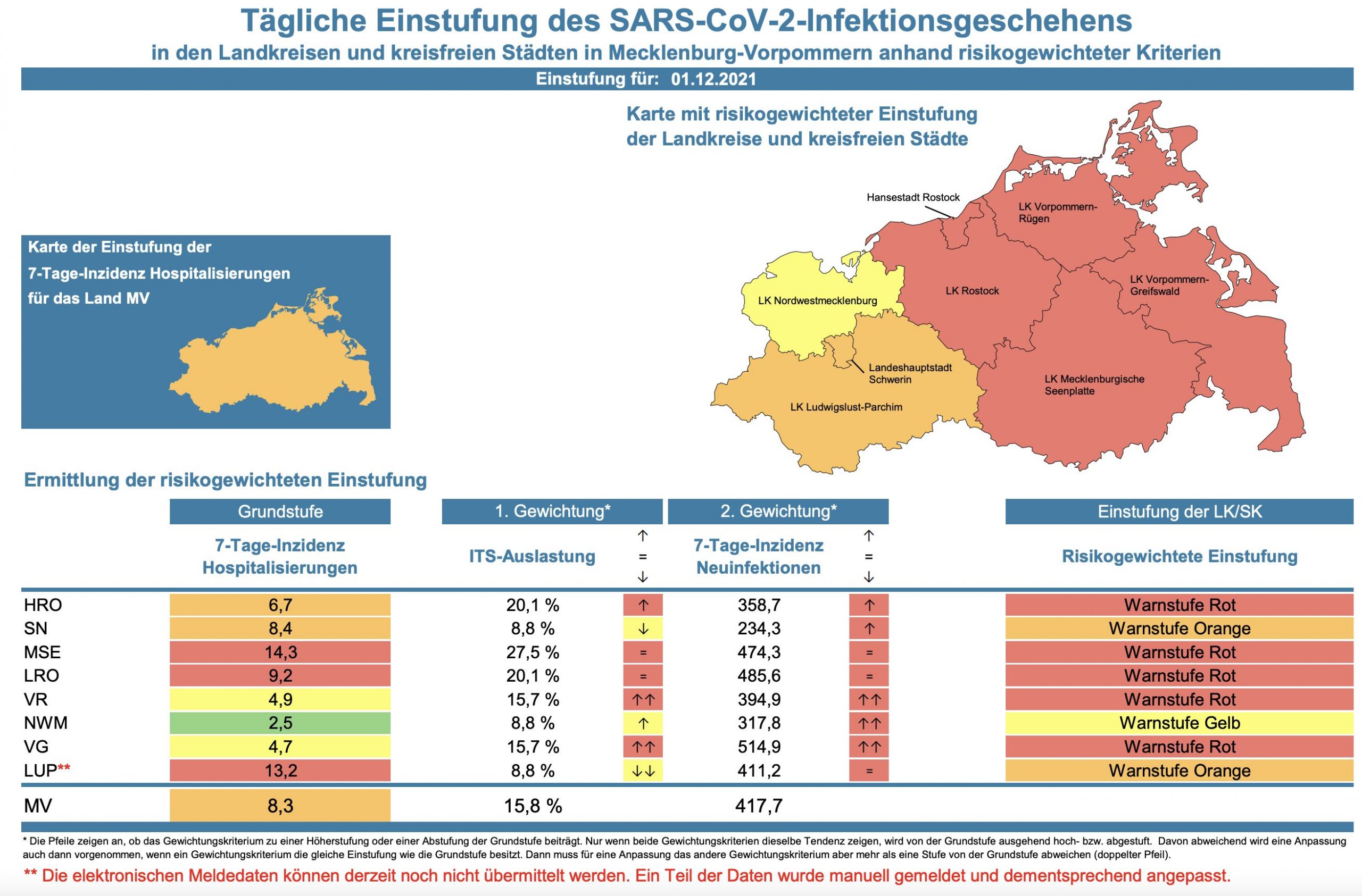 Die Hospitalisierung in ganz Mecklenburg-Vorpommern ging von 8,8 auf 8,3 zurück. Die Inzidenz des Landes steigt von 393,1 auf 417,7. Das Land Mecklenburg-Vorpommern meldet heute 1539 Neuinfektionen und zwei neue Todesfälle.