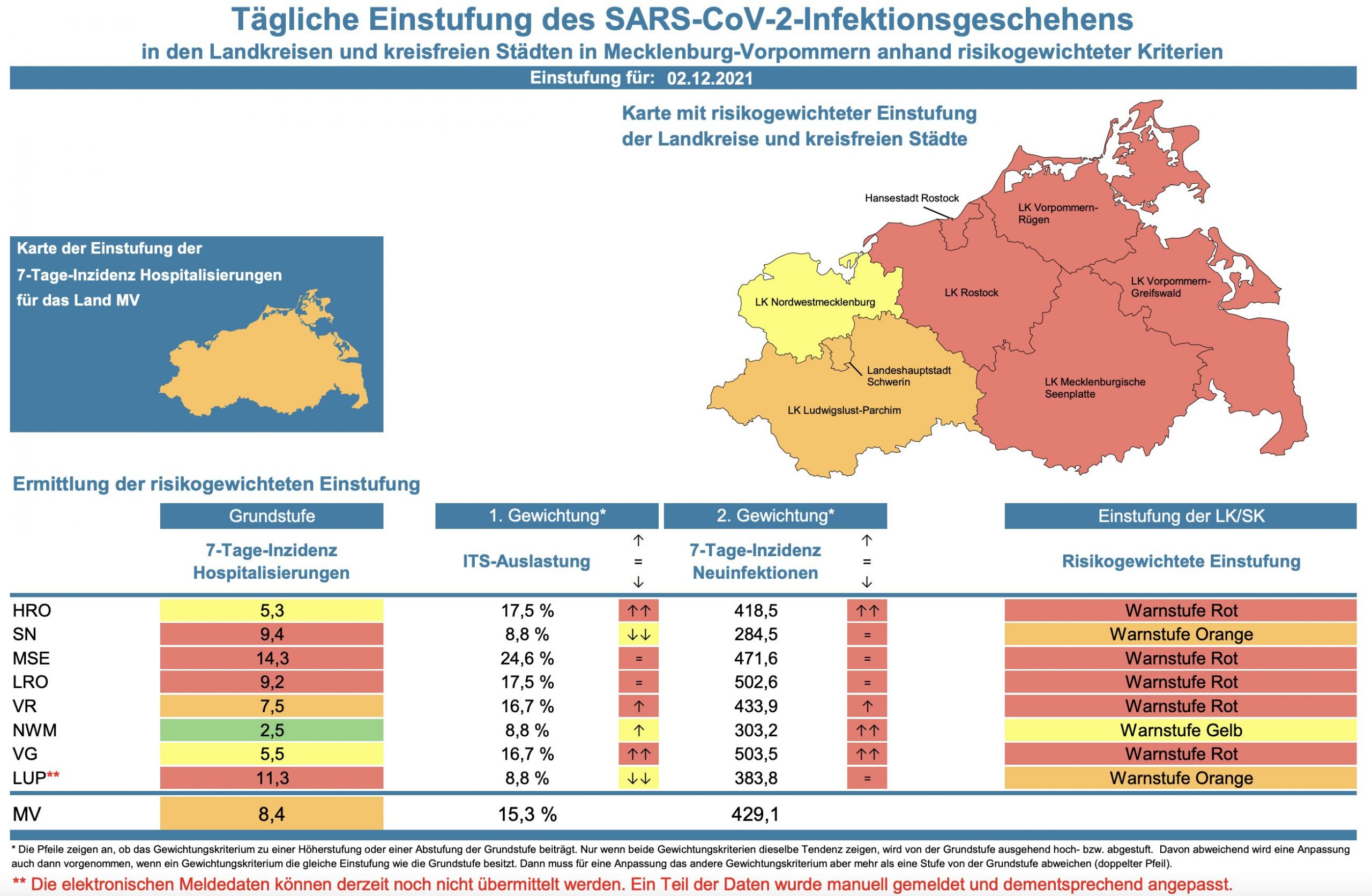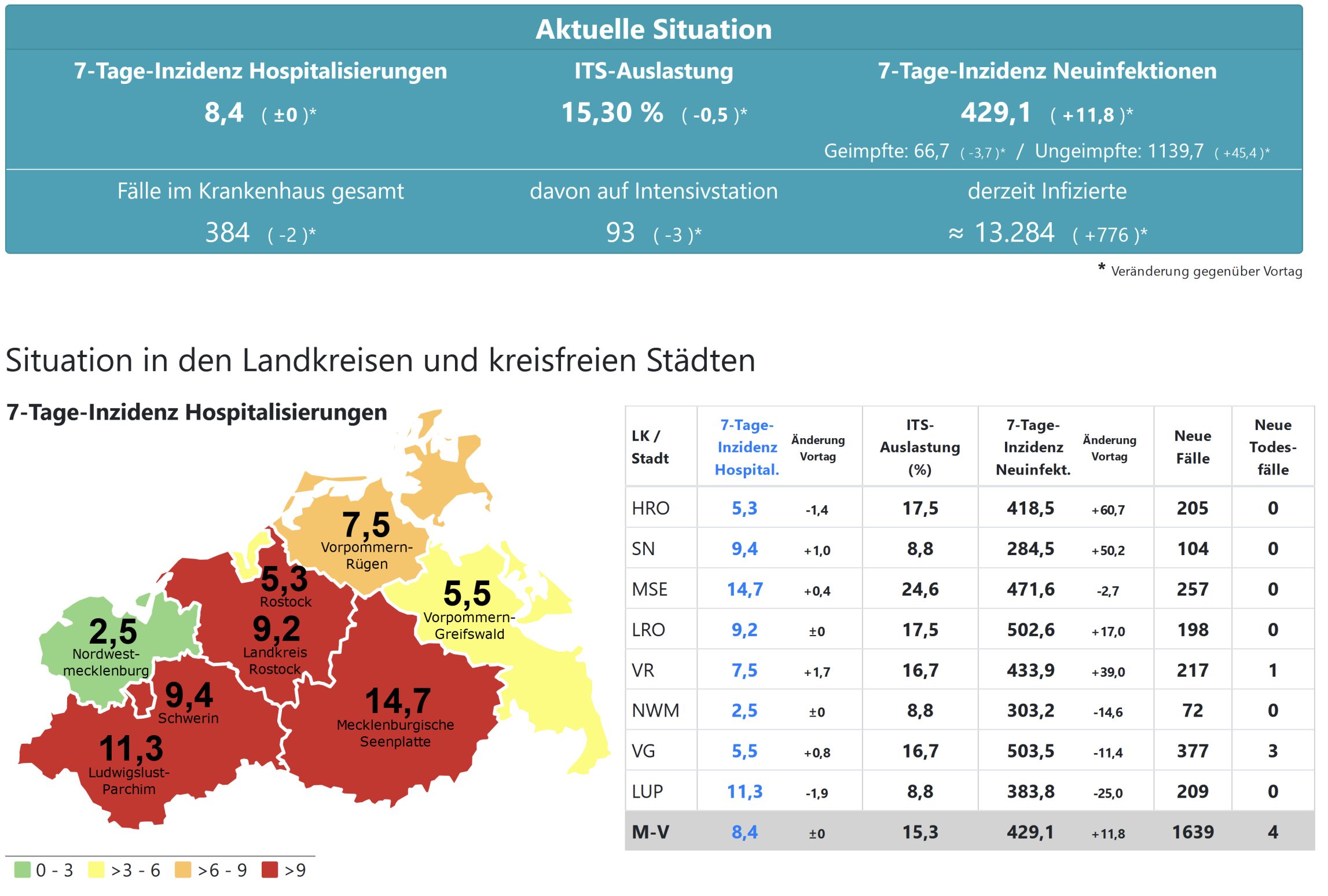 Die Hospitalisierung in ganz Mecklenburg-Vorpommern ist bei 8,4 geblieben. Die Inzidenz des Landes steigt von 417,7 auf 429,1. Das Land Mecklenburg-Vorpommern meldet heute 1639 Neuinfektionen und vier neue Todesfälle.