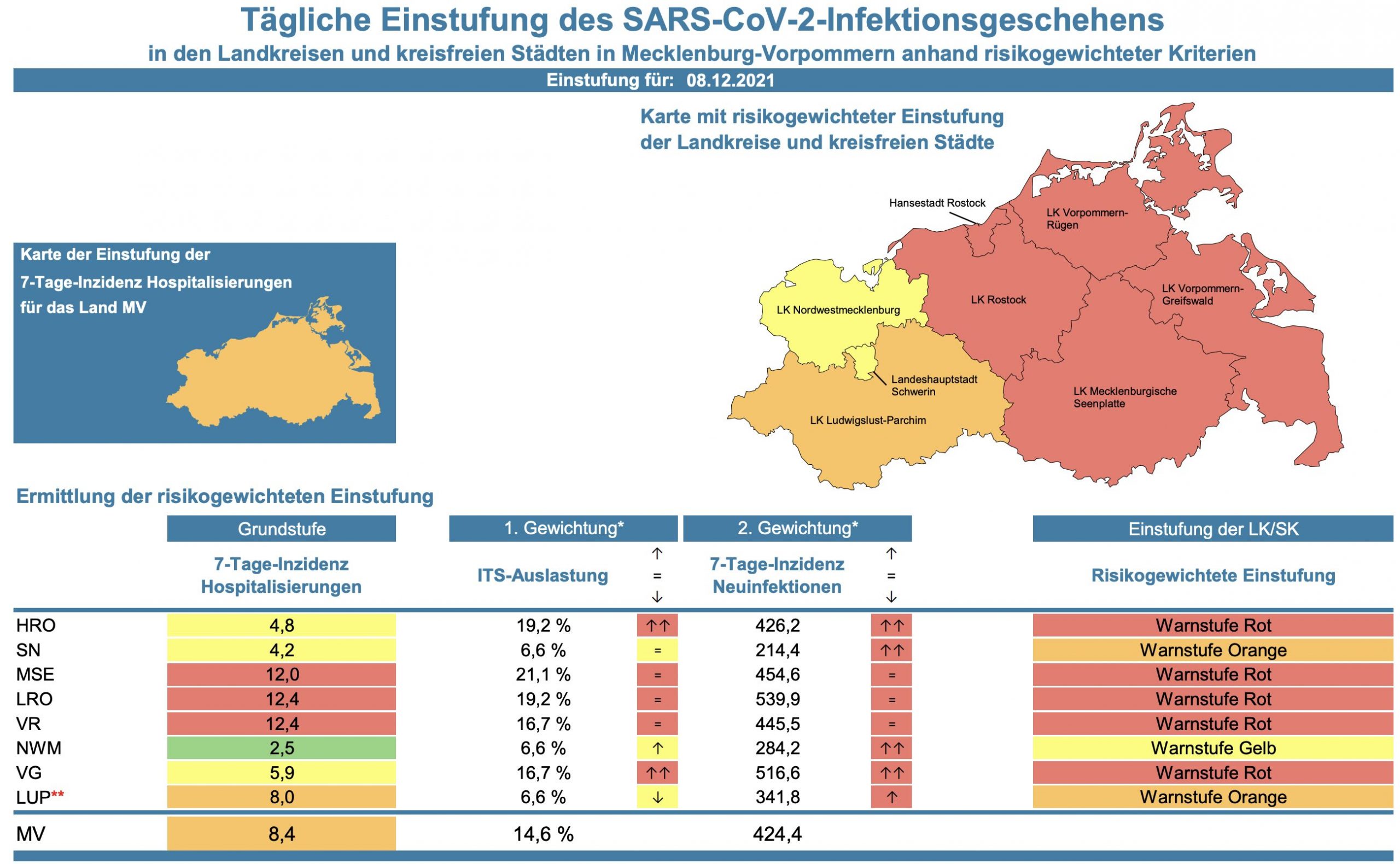 Die Hospitalisierung in ganz Mecklenburg-Vorpommern steigt von 8,1 auf 8,4. Die Inzidenz des Landes sinkt von 434,8 auf 424,4. Das Land Mecklenburg-Vorpommern meldet heute 1425 Neuinfektionen und sechs neue Todesfälle.