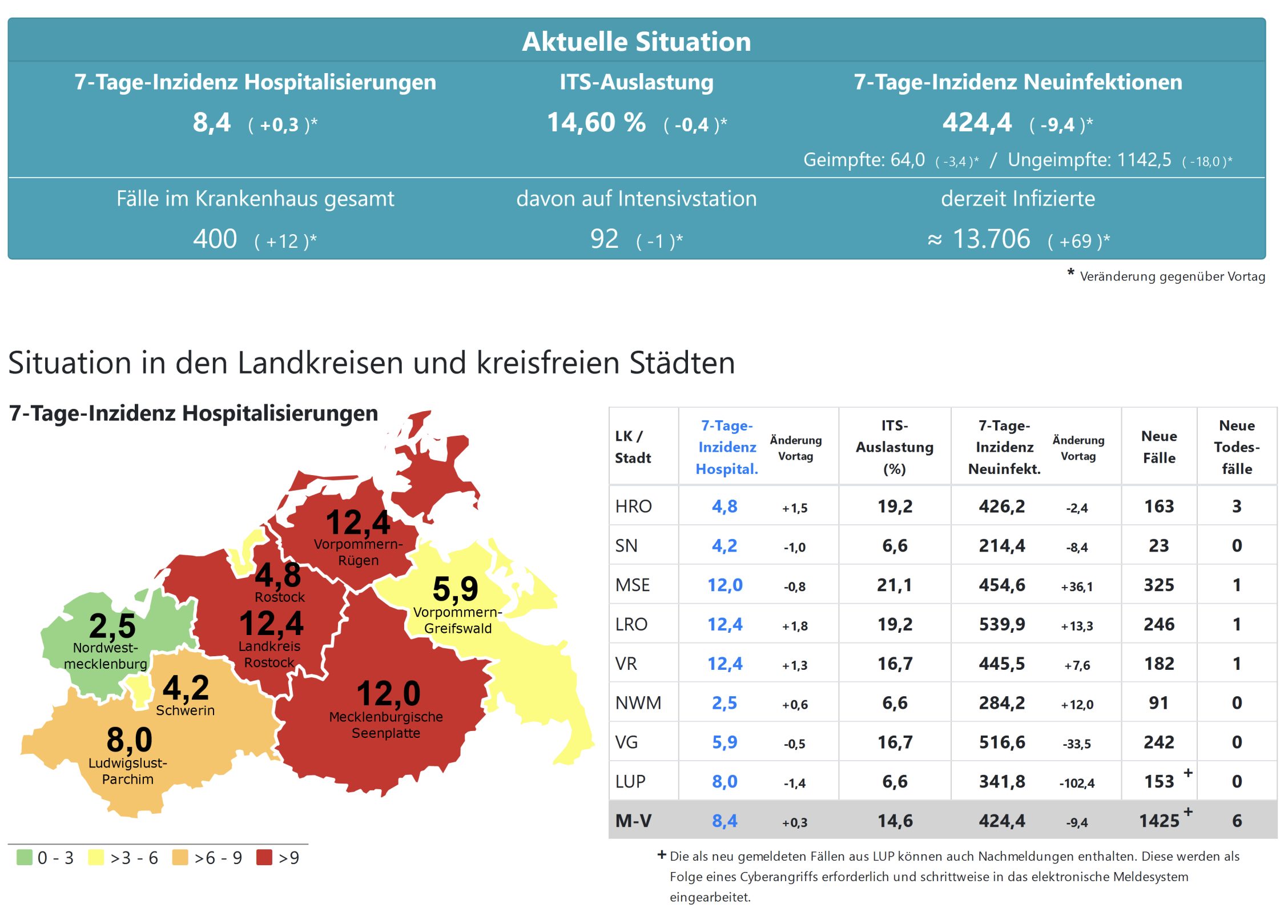 Die Hospitalisierung in ganz Mecklenburg-Vorpommern steigt von 8,1 auf 8,4. Die Inzidenz des Landes sinkt von 434,8 auf 424,4. Das Land Mecklenburg-Vorpommern meldet heute 1425 Neuinfektionen und sechs neue Todesfälle.
