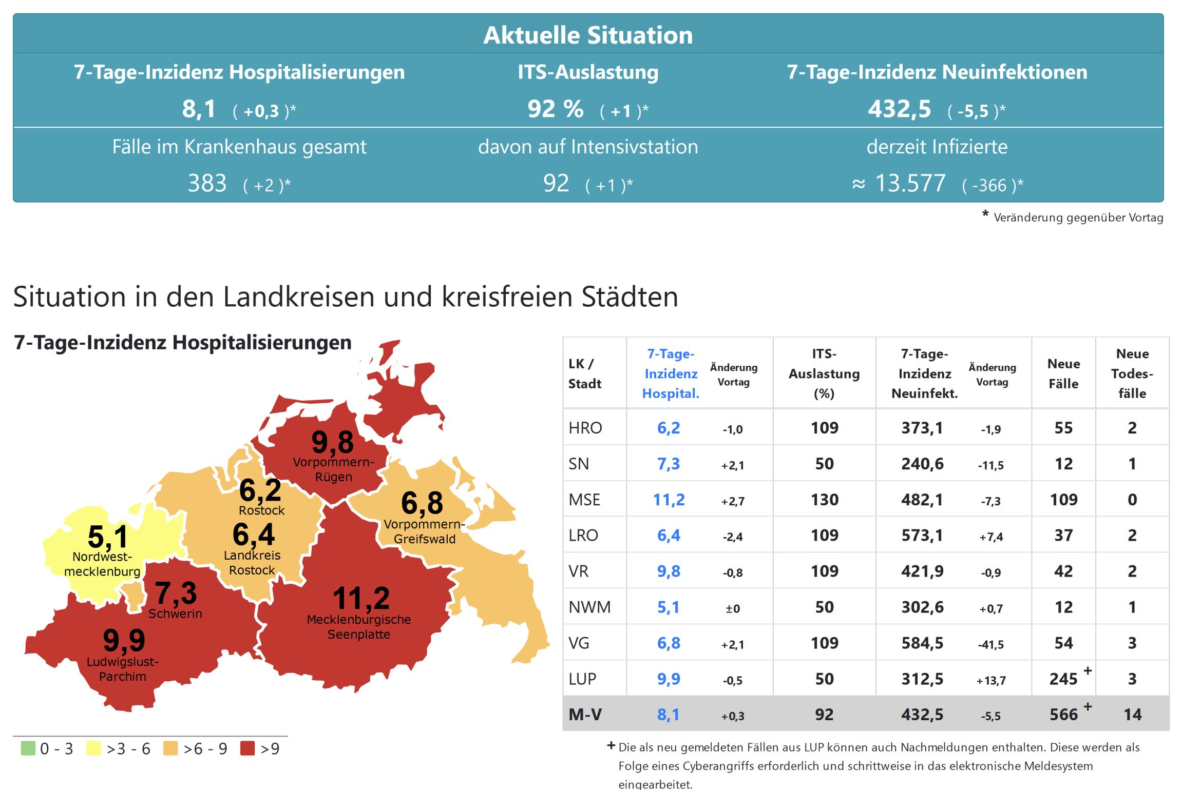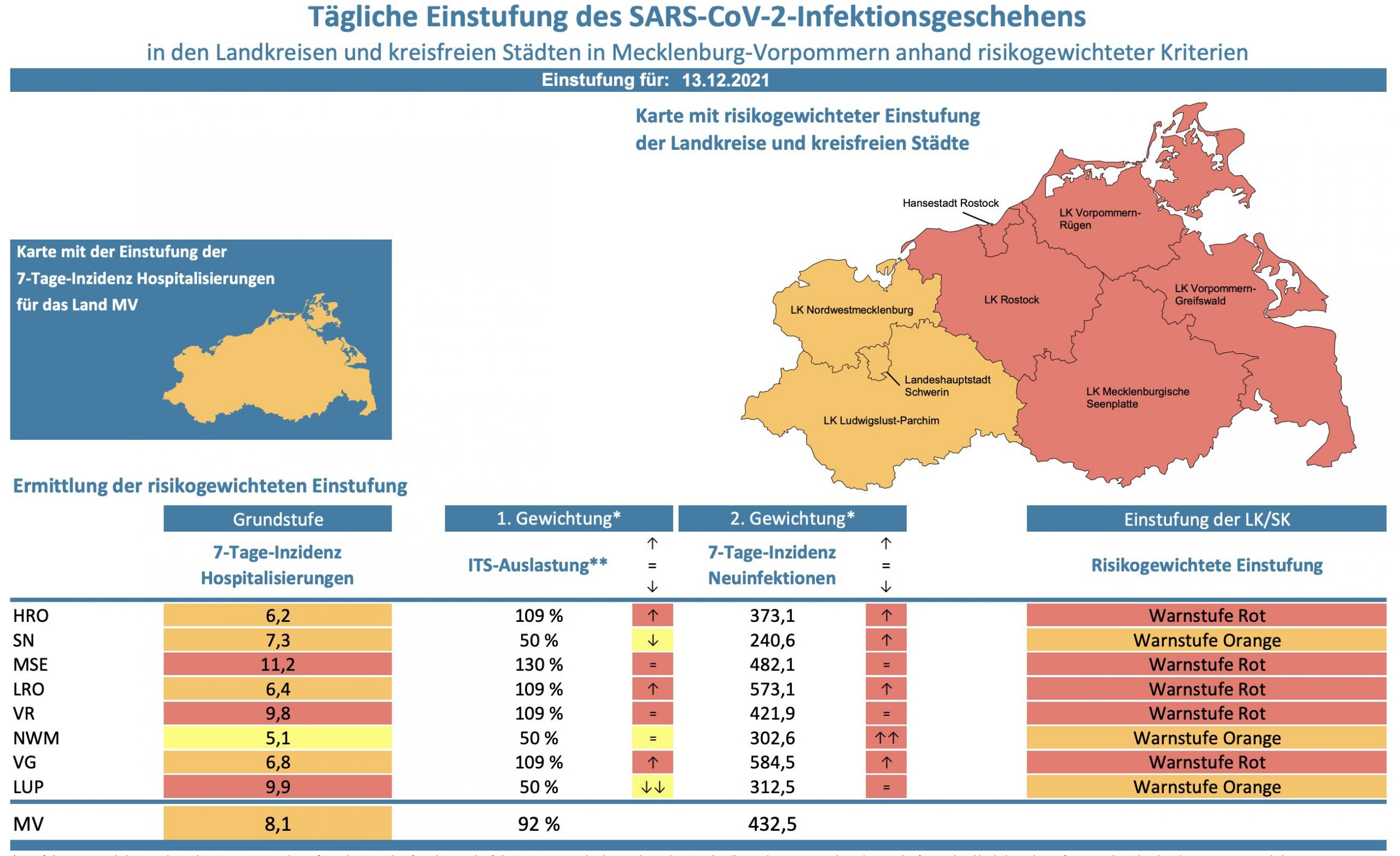 Die Hospitalisierung in ganz Mecklenburg-Vorpommern steigt von 7,8 auf 8,1., die Inzidenz des Landes sinkt von 438,9 auf 432,5. Das Land Mecklenburg-Vorpommern meldet heute 566 Neuinfektionen und 14 Todesfälle.