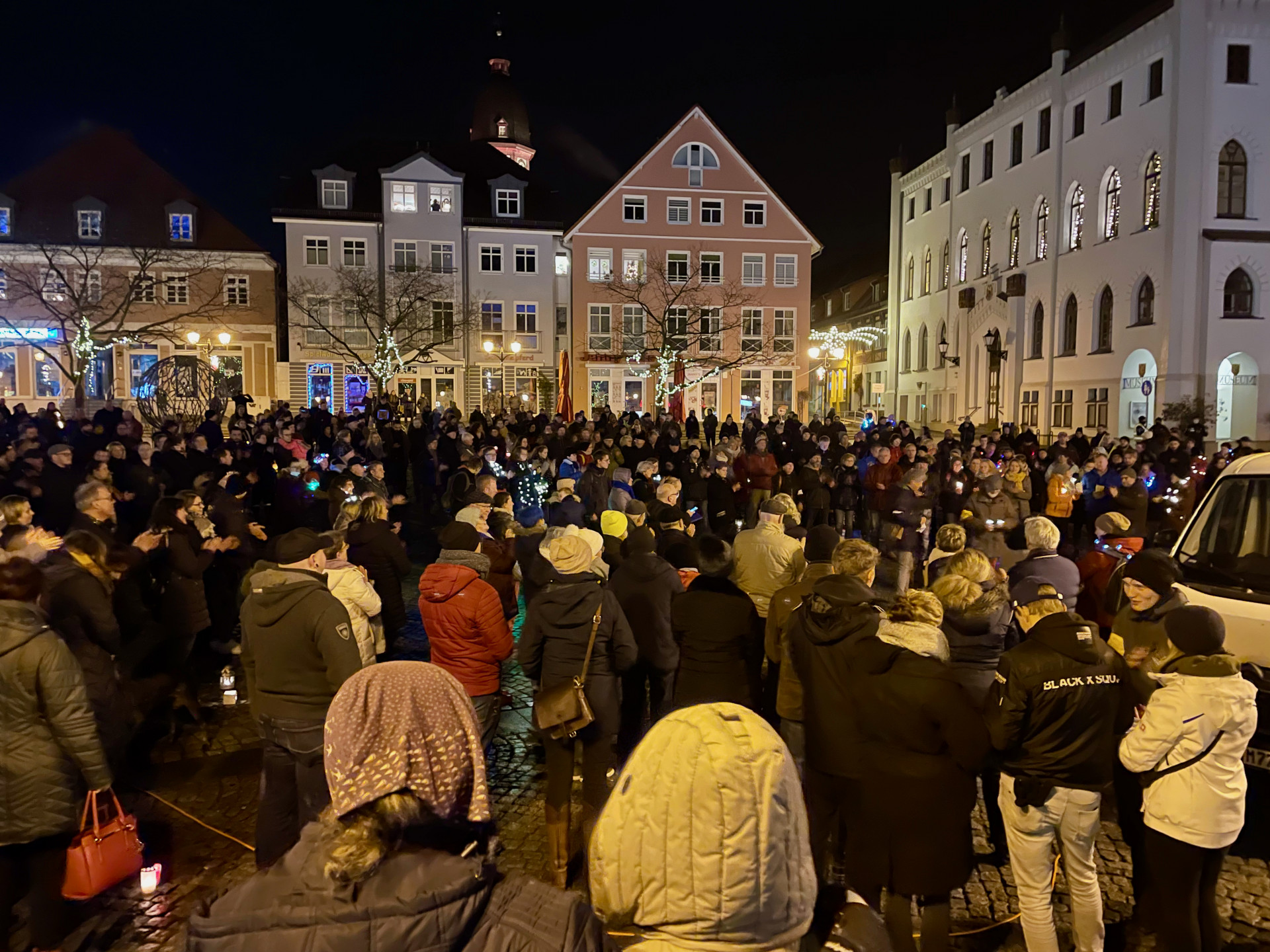 In Waren haben heute Abend so viele Menschen wie noch nie seit Pandemie-Beginn gegen die aktuellen Corona-Maßnahmen demonstriert. Laut Angaben der Polizei nahmen an der Demo und dem „Spaziergang“ durch die Stadt mindestens 500 Menschen teil – angemeldet und genehmigt waren 300. Unter den Teilnehmern viele Familien mit ihren Kindern. Zahlreiche Demonstranten trugen Lichter, ein paar wenige protestierten mit selbst gestalteten Plakaten. Masken wurden kaum getragen, mussten auch nicht, die Auflage war, den Abstand zu wahren. Das hat nicht überall geklappt, die Polizei ist aber nicht eingeschritten und spricht von einer friedlichen Demonstration ohne besondere Vorkommnisse.