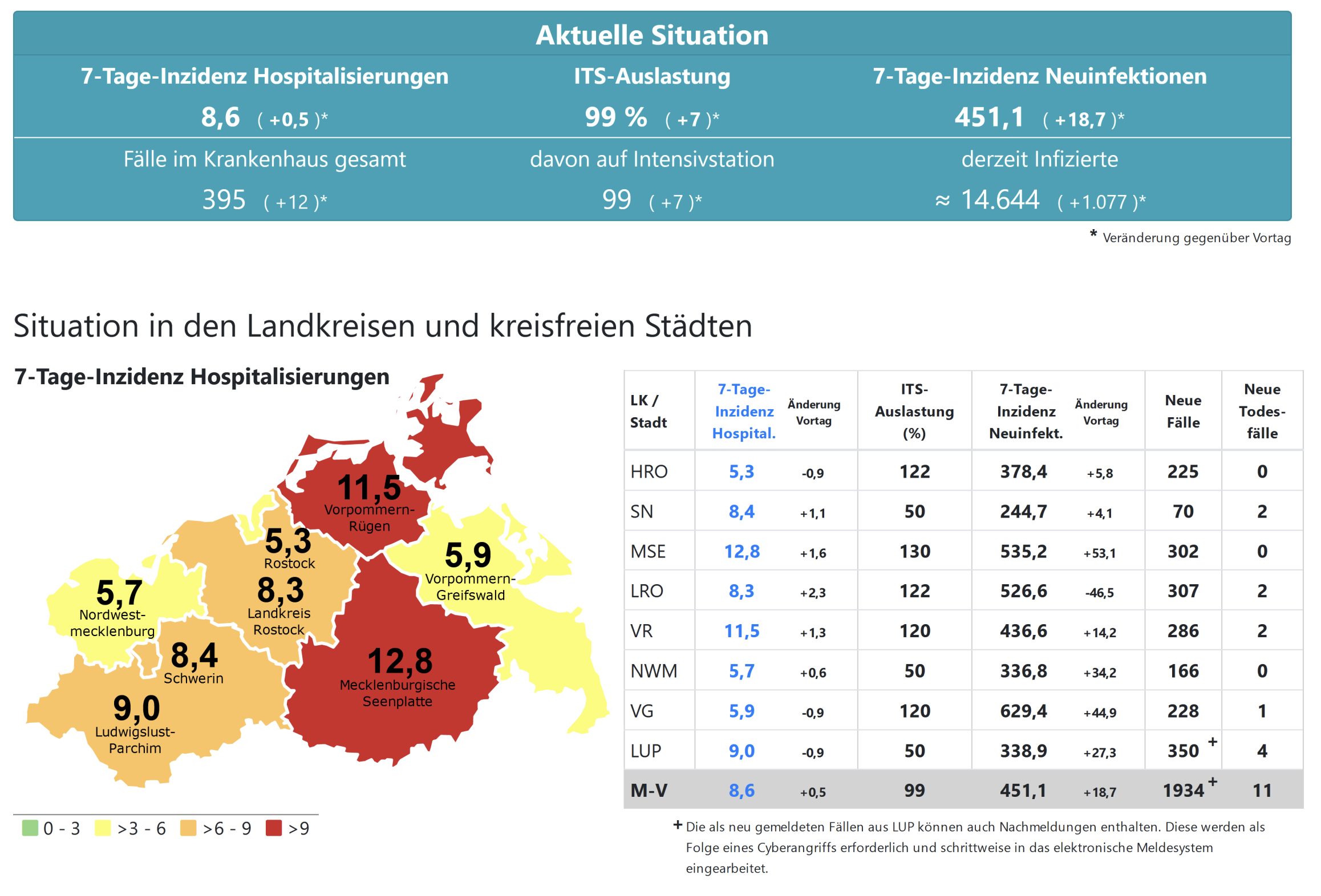 Die Hospitalisierung in ganz Mecklenburg-Vorpommern steigt von 8,1 auf 8,6, die Inzidenz des Landes steigt von 432,5 auf 451,1. Das Land Mecklenburg-Vorpommern meldet heute 1934 Neuinfektionen und 11 Todesfälle.