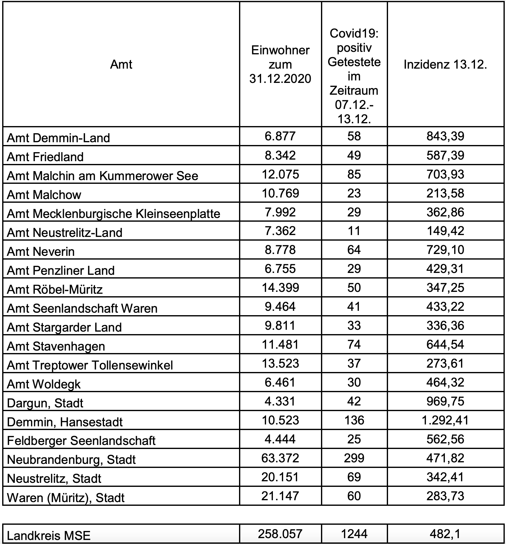 Unter diesem Artikel finden Sie, liebe Leserinnen und Leser, heute auch wieder die Inzidenzwerte der Mecklenburgischen Seenplatte – aufgeschlüsselt nach Städten und Ämtern.