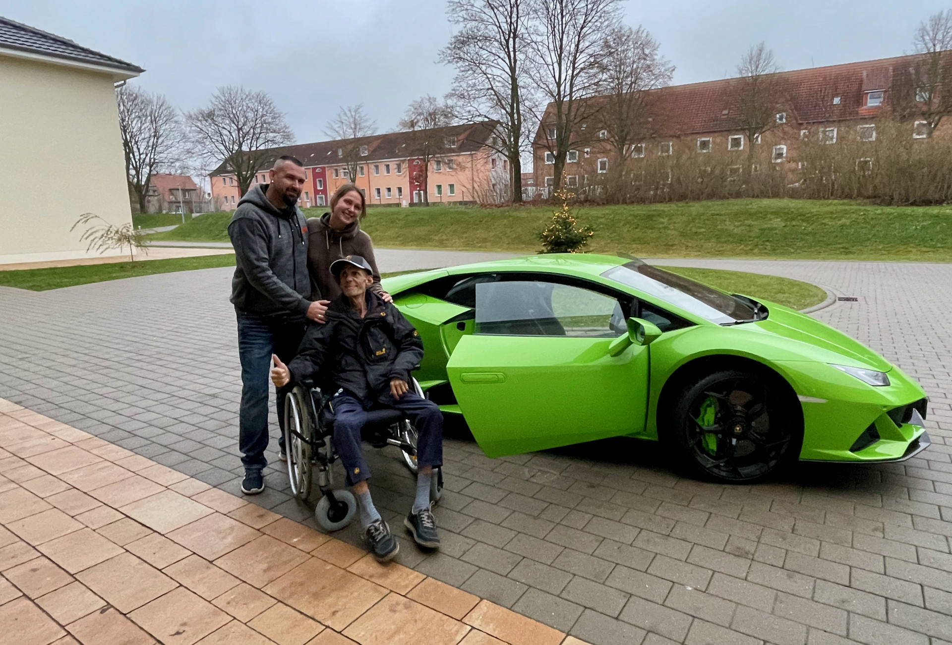 „Ihr seid so toll, Ihr seid ja wahnsinnig. Das ist so verrückt.“ So kommentierte Jörg nach anfänglicher Sprachlosigkeit eine Überraschung, die das Team des DRK-Hospizes „Müritzpark“ für ihn klammheimlich organisiert hat. Jörg ist 65 Jahre alt, sehr schwer krank und wohnt seit rund einem Monat im Warener Hospiz. Gestern ist ihm ein großer Wunsch erfüllt worden – einmal mit einem richtig schnellen Auto wie einem Lamborghini fahren. Ermöglicht hat ihm das Matthias Krumm aus Mirow, der mit seinem auffälligen PS-starken Wagen am Nachmittag vors Hospiz rollte. Schon lange, bevor man den grünen Flitzer sehen konnte, kündigten die Motorengeräusche seine Ankunft an. Neben den Mitarbeitern wurde Jörg von seiner Tochter Daniela und seinem Sohn Matthias begleitet. Sie wussten von der Überraschung für den schwerkranken Papa, haben aber bis zum Schluss dicht gehalten.