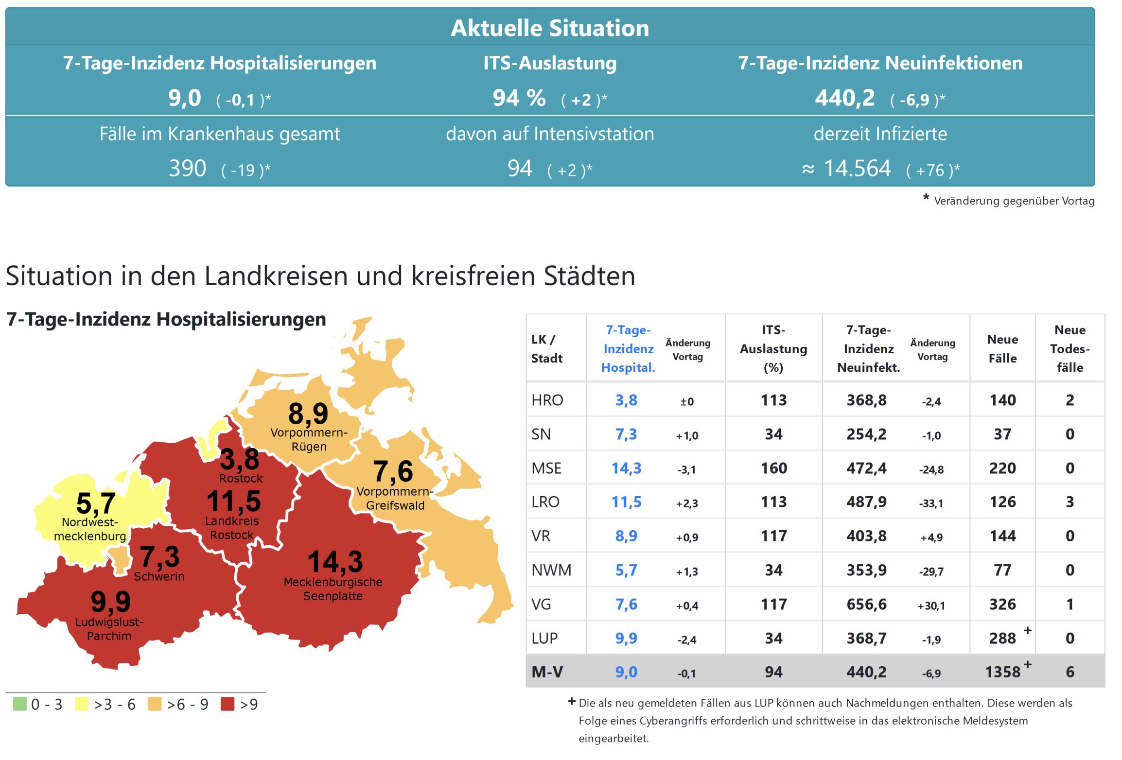 Die Hospitalisierung in ganz Mecklenburg-Vorpommern sinkt minimal von 9,2 auf 9,0, die Inzidenz des Landes von 447,7 auf 440,2. Das Land Mecklenburg-Vorpommern meldet heute 1358 Neuinfektionen und sechs neue Todesfälle.