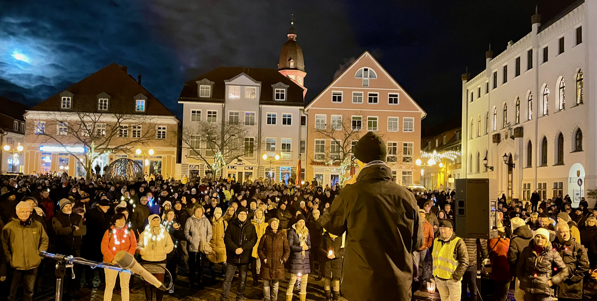 Wenzel betonte, dass er als Privatperson spricht, weil sein Auftritt als Pastor nicht gewünscht sei, doch sprach er während seiner Rede immer wieder von seinen Erfahrungen, die er als Pastor mache. „Ich sorge mich um die Stadt und das Zusammenleben hier und möchte mich ausdrücklich bei den Organisatoren der Demo, Manuela Lenuweit und Thomas Müller, bedanken“, so Wenzel. Der Bundespräsident habe ihm auf seinem Brief, in dem er Corona-Maßnahmen kritisierte, noch nicht geantwortet. Auch viele andere hätten von Politikern keine Antwort bekommen. Deshalb forderte Wenzel die Teilnehmer auf, an die gewählten Landespolitiker einen Weihnachtsgruß zu schicken und darin zu schreiben, dass man keinen Politiker mehr wähle, der sich für eine Impfpflicht engagiere.