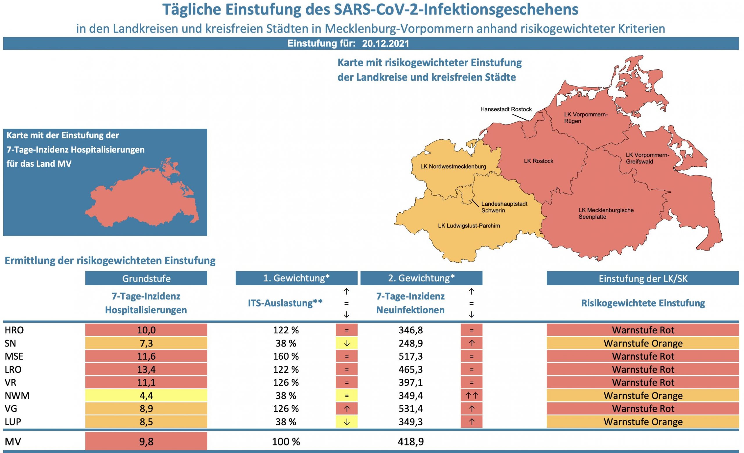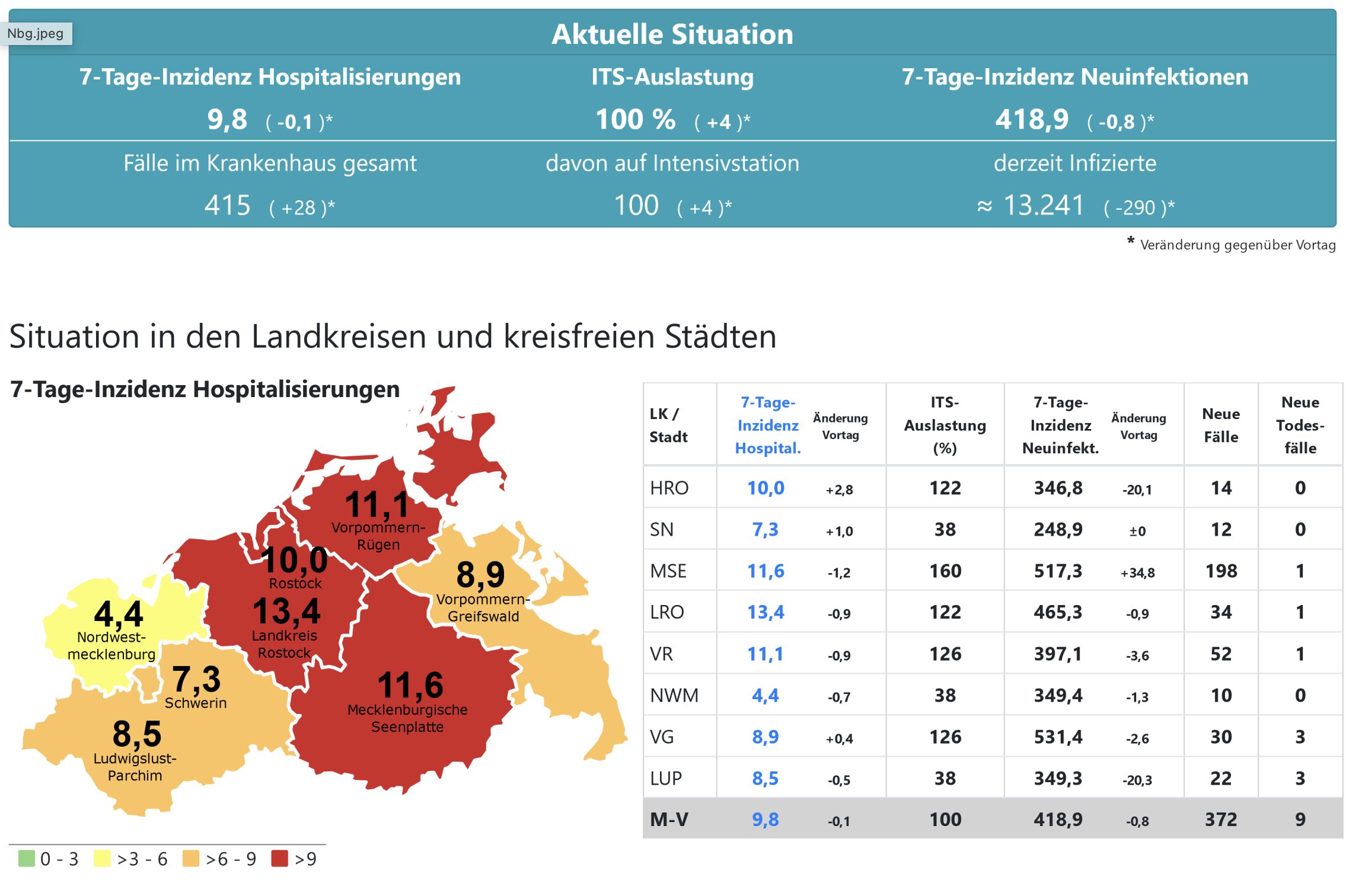 Die Hospitalisierung in ganz Mecklenburg-Vorpommern liegt jetzt bei 9,8, die Inzidenz des Landes sinkt von 420,6 auf 418,9. Das Land Mecklenburg-Vorpommern meldet heute 372 Neuinfektionen und neun neue Todesfälle.