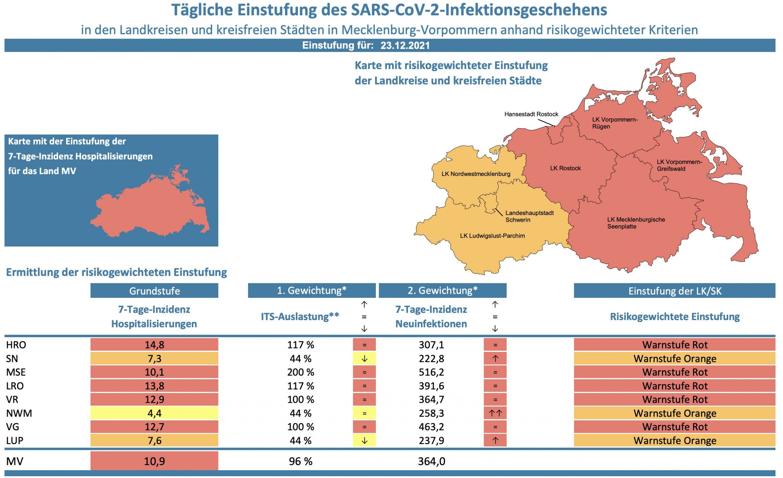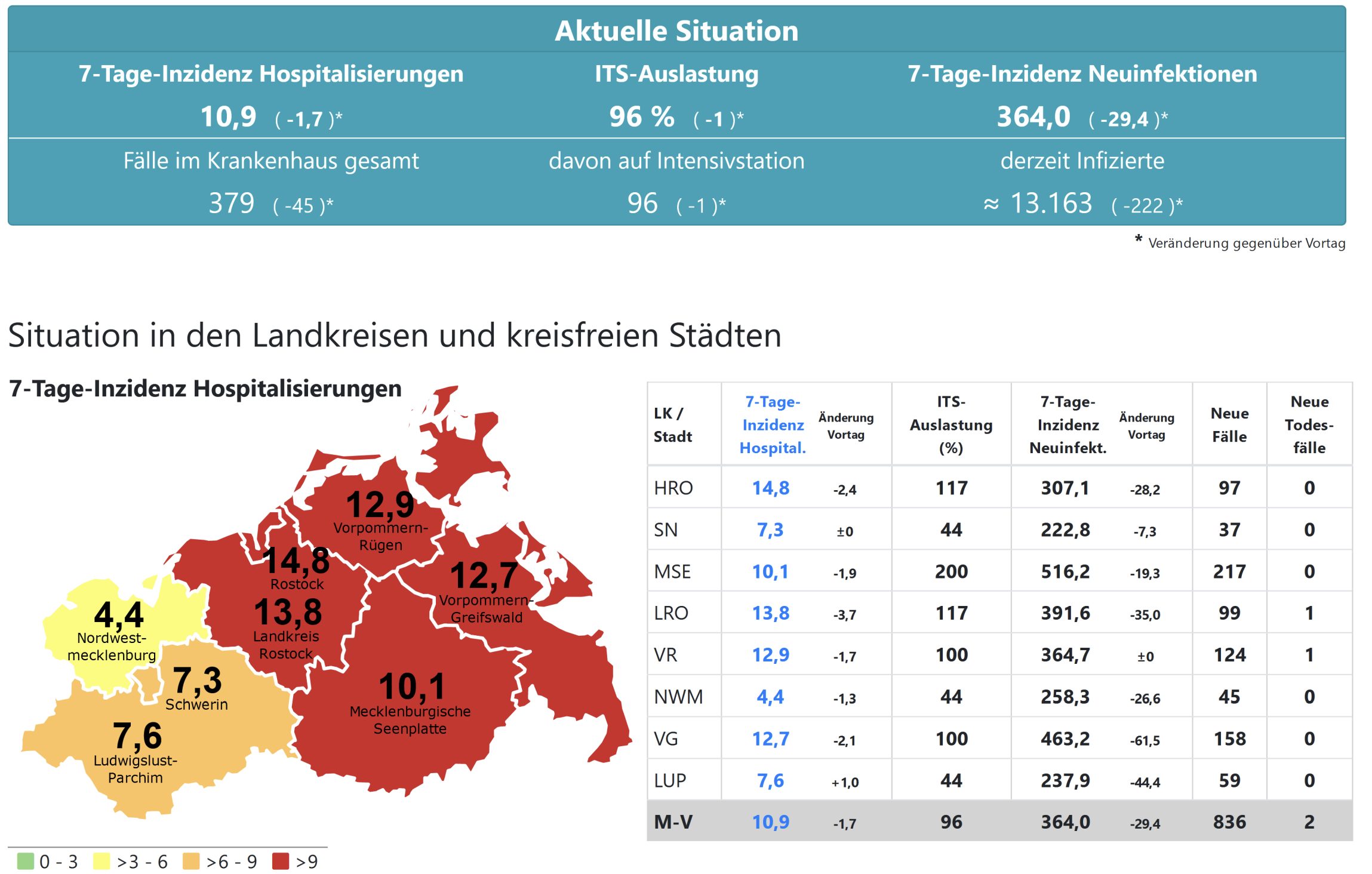 Die Hospitalisierung in ganz Mecklenburg-Vorpommern liegt jetzt bei 10,9, die Inzidenz des Landes sinkt von 394,2 auf 364,0 Das Land Mecklenburg-Vorpommern meldet heute 836Neuinfektionen und zwei neue Todesfälle.