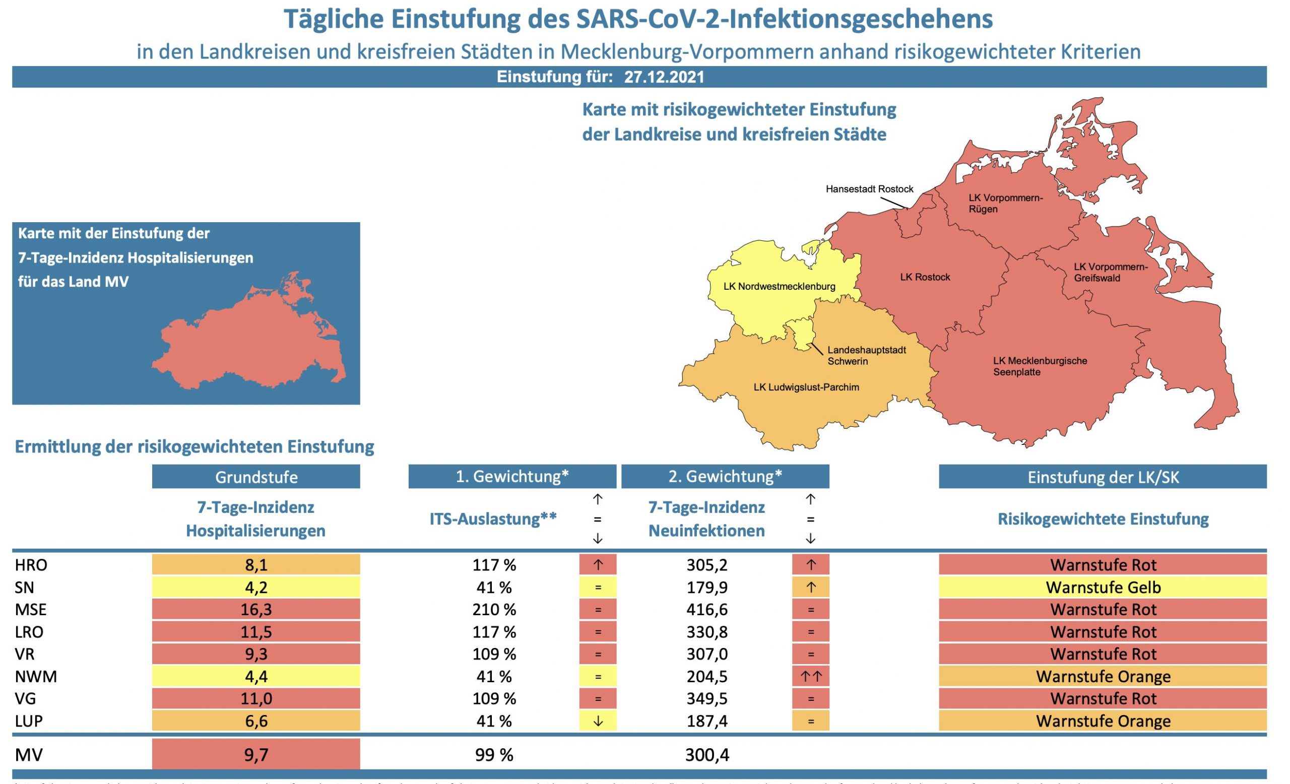 Die Hospitalisierung in ganz Mecklenburg-Vorpommern liegt heute bei 9,7, die Inzidenz des Landes bei 300,4. Das Land Mecklenburg-Vorpommern meldet heute 366 Neuinfektionen und 12 neue Todesfälle.