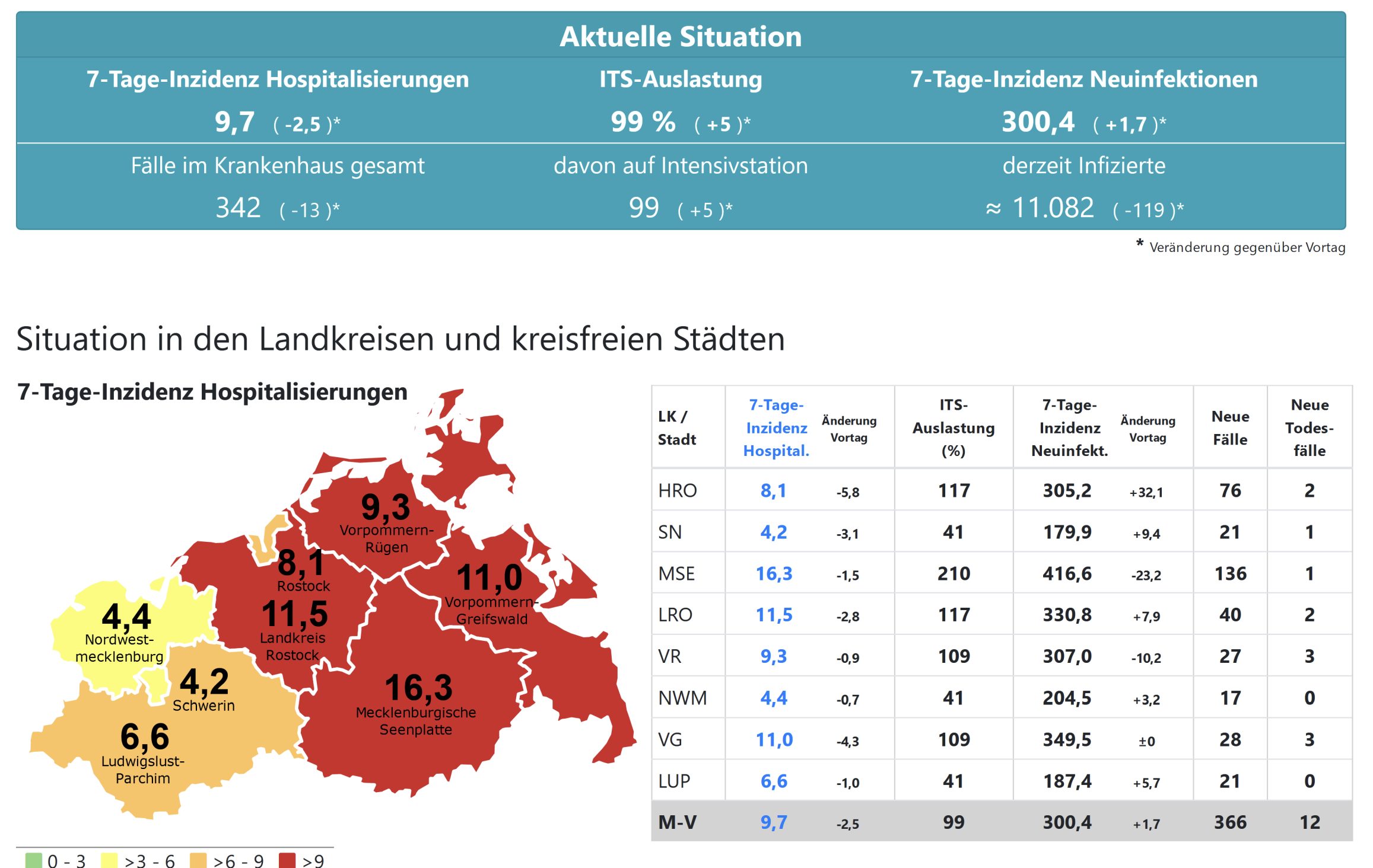 Die Hospitalisierung in ganz Mecklenburg-Vorpommern liegt heute bei 9,7, die Inzidenz des Landes bei 300,4. Das Land Mecklenburg-Vorpommern meldet heute 366 Neuinfektionen und 12 neue Todesfälle.