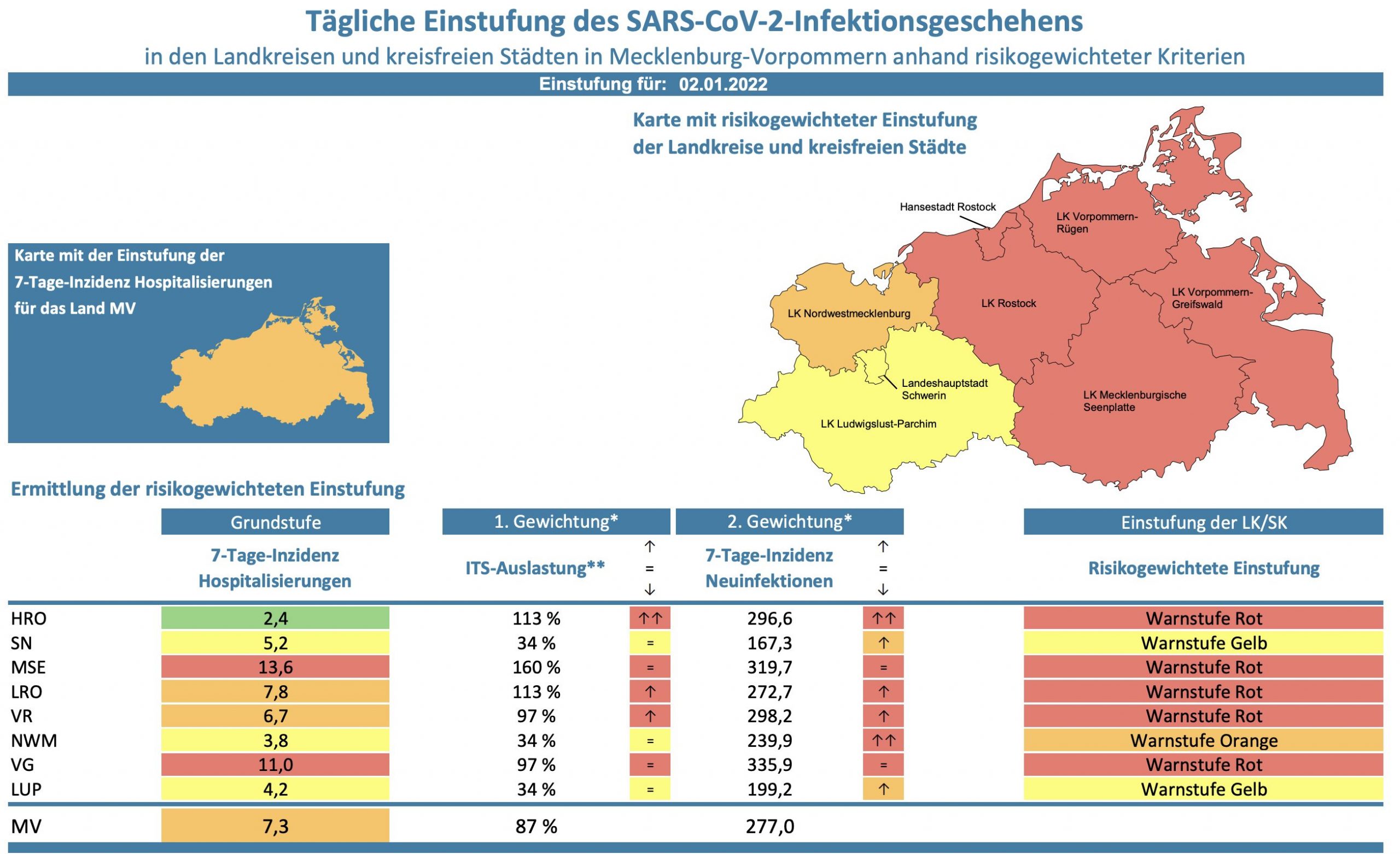 Die Hospitalisierung in ganz Mecklenburg-Vorpommern liegt heute bei 7,3, die Inzidenz des Landes bei 277. Das Land Mecklenburg-Vorpommern meldet heute 3985 Neuinfektionen und 2 neue Todesfälle.