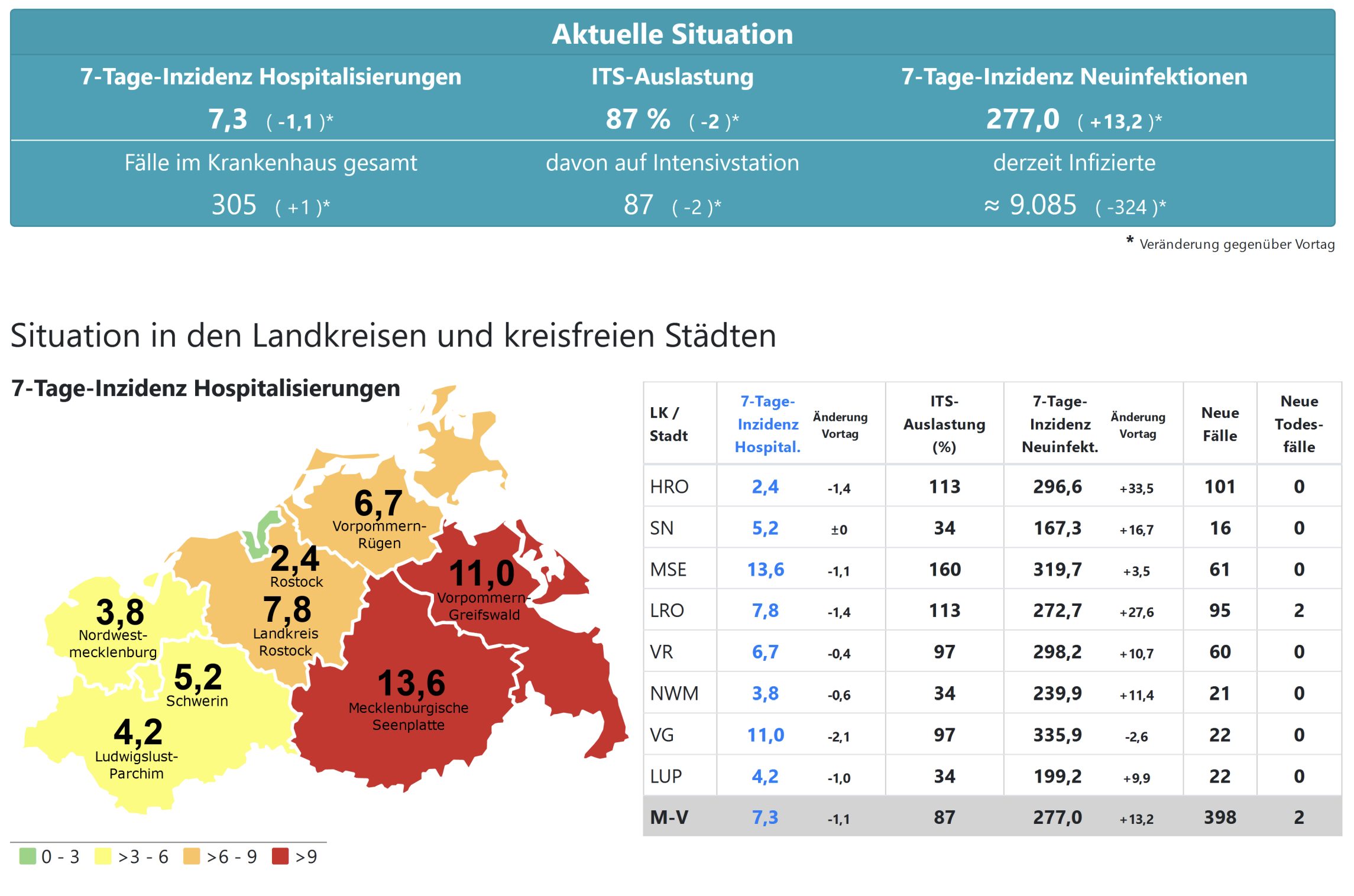 Die Hospitalisierung in ganz Mecklenburg-Vorpommern liegt heute bei 7,3, die Inzidenz des Landes bei 277. Das Land Mecklenburg-Vorpommern meldet heute 3985 Neuinfektionen und 2 neue Todesfälle.