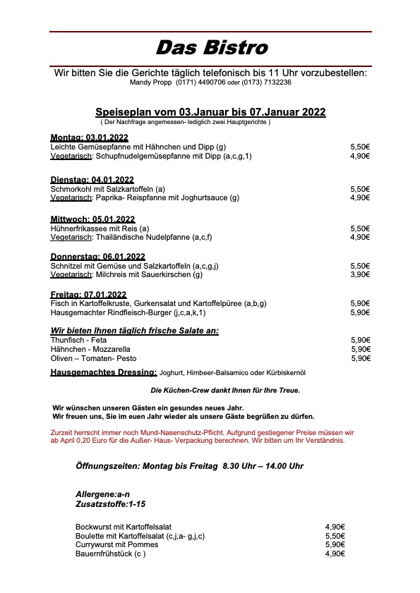 Mandy Propp und ihr Team von „Das Bistro“ am Warener Amtsbrink starten mit einer leichten Gemüsepfanne, Hähnchen und Dipp in die erste Arbeitswoche des neuen Jahres. Hier der komplette Speiseplan für diese Woche: