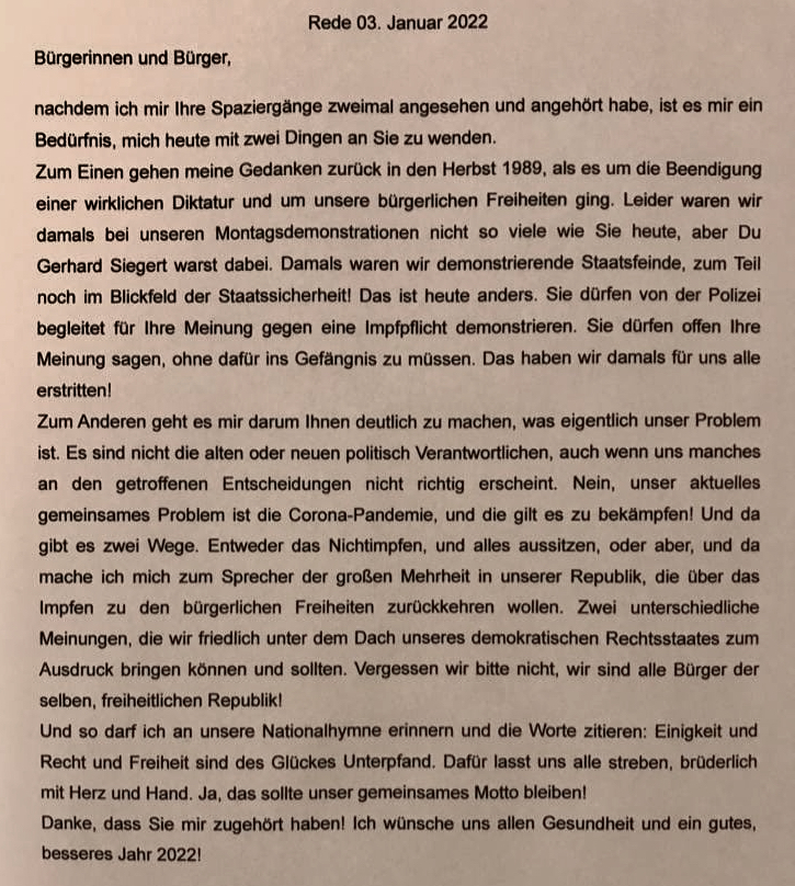 Während die Spaziergänge am Montag gegen die Corona-Maßnahmen in Waren und Röbel sehr ruhig ablaufen, ziehen die Malchower Demonstranten – gestern waren es nach Auskunft der Polizei um die 180 – recht lautstark durch die Straßen, sprechen von „Diktaturen“ und fordern sogar zu Systemumstürzen auf. Gestern Abend kam es zum Eklat, als Stadtvertreter Joachim Stein (Grüne) zu den Demonstranten sprechen wollte. Zum einen gab es für seine sehr sachlichen Ausführungen von Anfang an Buh-Rufe, zum anderen wurde ihm nach übereinstimmenden Berichten das Mikro einfach abgedreht. Das führt derzeit in Malchow zu heftigen Diskussionen, vor allem, weil die Demonstranten auf der einen Seite fordern, auch andere Meinungen gelten zu lassen, dann selbst aber keine anderen Meinungen tolerieren.