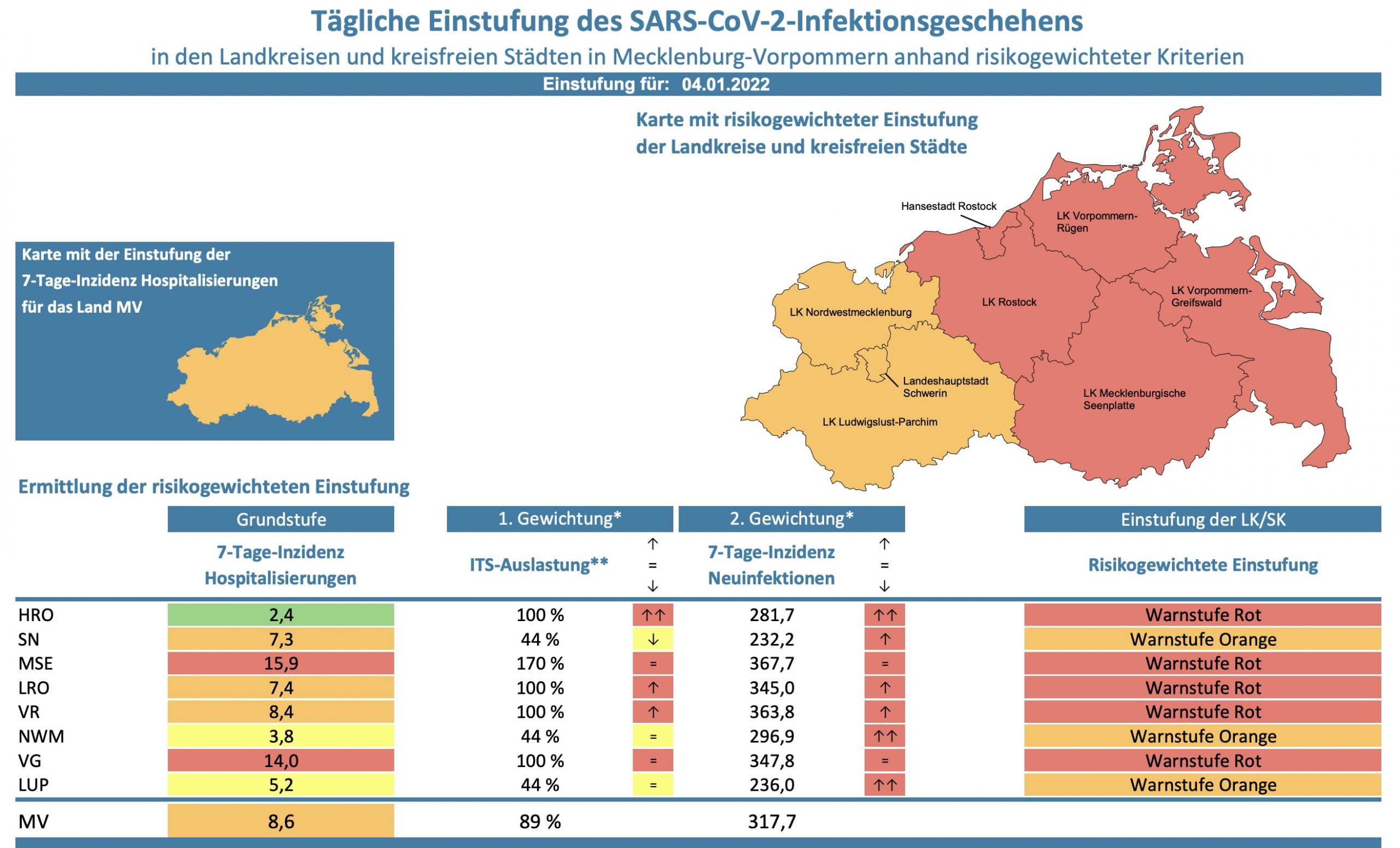 Die Hospitalisierung in ganz Mecklenburg-Vorpommern liegt heute bei 8,6, die Inzidenz des Landes steigt von 284,3 auf 317,7. Das Land Mecklenburg-Vorpommern meldet heute 1620 Neuinfektionen und 5 neue Todesfälle.