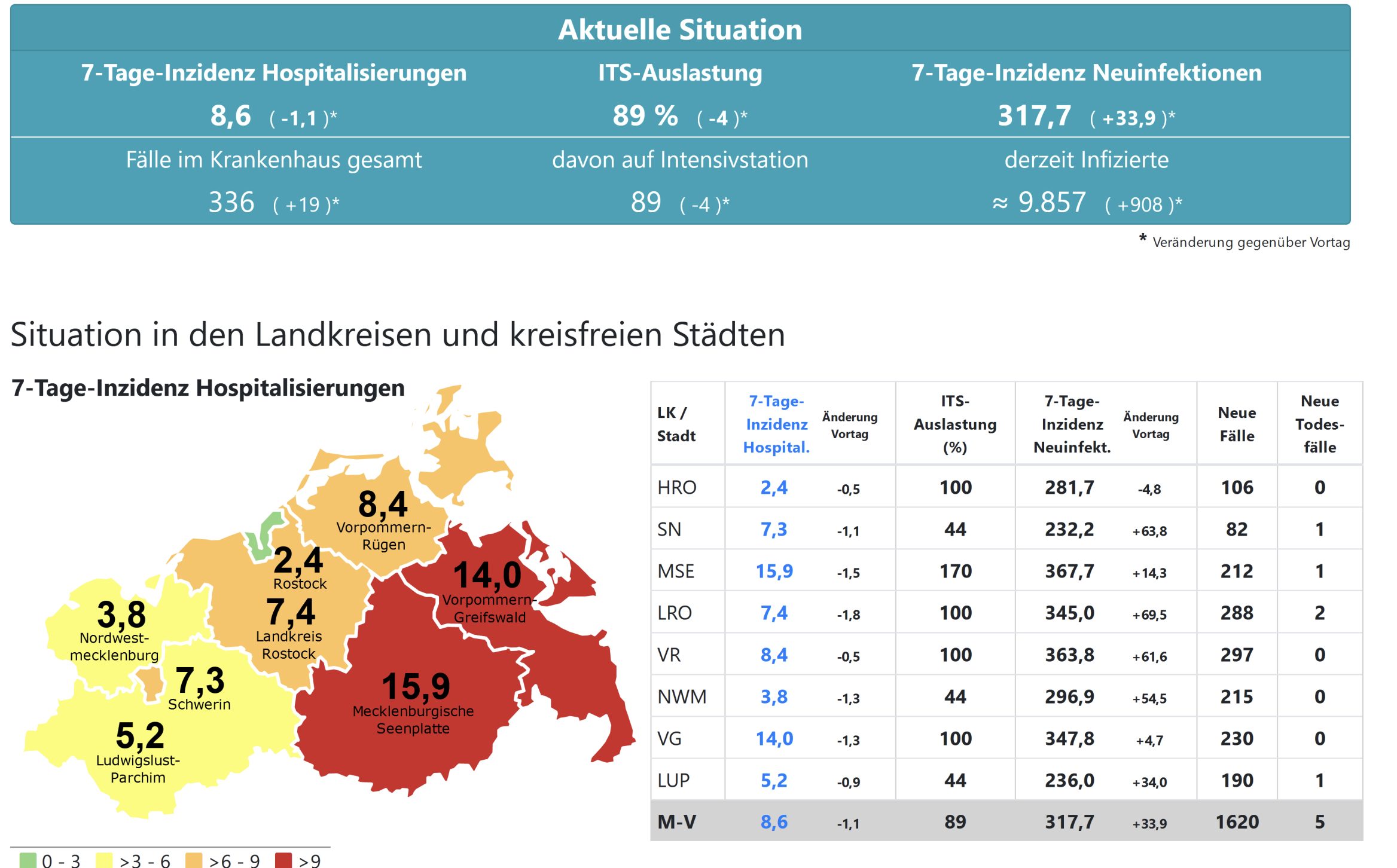 Die Hospitalisierung in ganz Mecklenburg-Vorpommern liegt heute bei 8,6, die Inzidenz des Landes steigt von 284,3 auf 317,7. Das Land Mecklenburg-Vorpommern meldet heute 1620 Neuinfektionen und 5 neue Todesfälle.