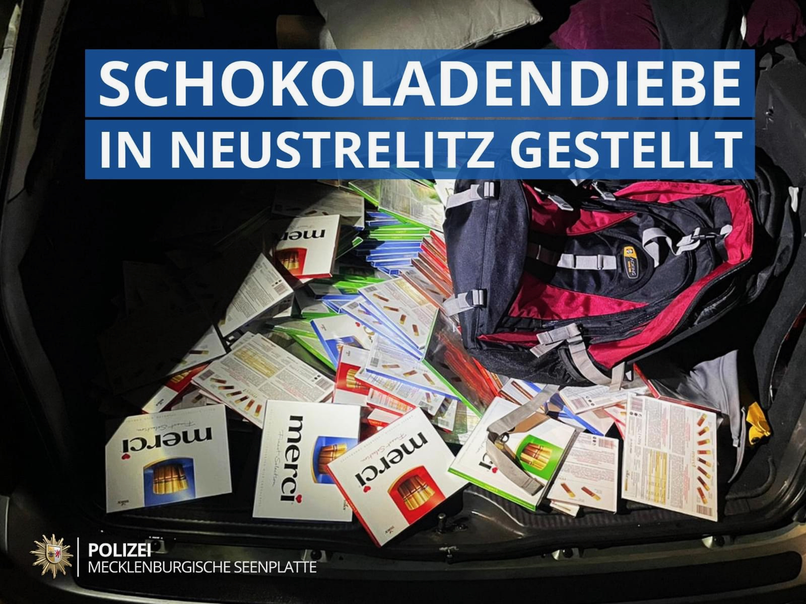 Einen Diebstahl in großem Stil  hat ein Ladendetektiv in Neustrelitz gestern Abend in einem Supermarkt verhindert. Ein 45 Jahre alter moldawischer Mann wollte Lebensmittel, darunter 70 Packungen Schokolade im Gesamtwert von 250 Euro entwenden. Der Ladendetektiv konnte ihn aufhalten. In der Nähe stellte die Polizei einen Pkw mit polnischen Kennzeichen fest, in dem zwei 19-jährige Männer gleicher Herkunft saßen. Die Polizisten schauten sich das Auto genauer an und entdeckten mehrere hundert Tafeln Schokolade im Gesamtwert von etwa 1150 Euro. Da die Tatverdächtigen keinen Nachweis für diese nicht  handelsübliche Menge an Schokoladentafeln vorzeigen konnten, hat die Kriminalpolizei in Neustrelitz die Ermittlungen wegen des Verdachts des Diebstahls aufgenommen. Die Tatverdächtigen konnten nach Befragung, Sicherstellung des Diebesgutes und Feststellung der Identitäten wieder gehen.
