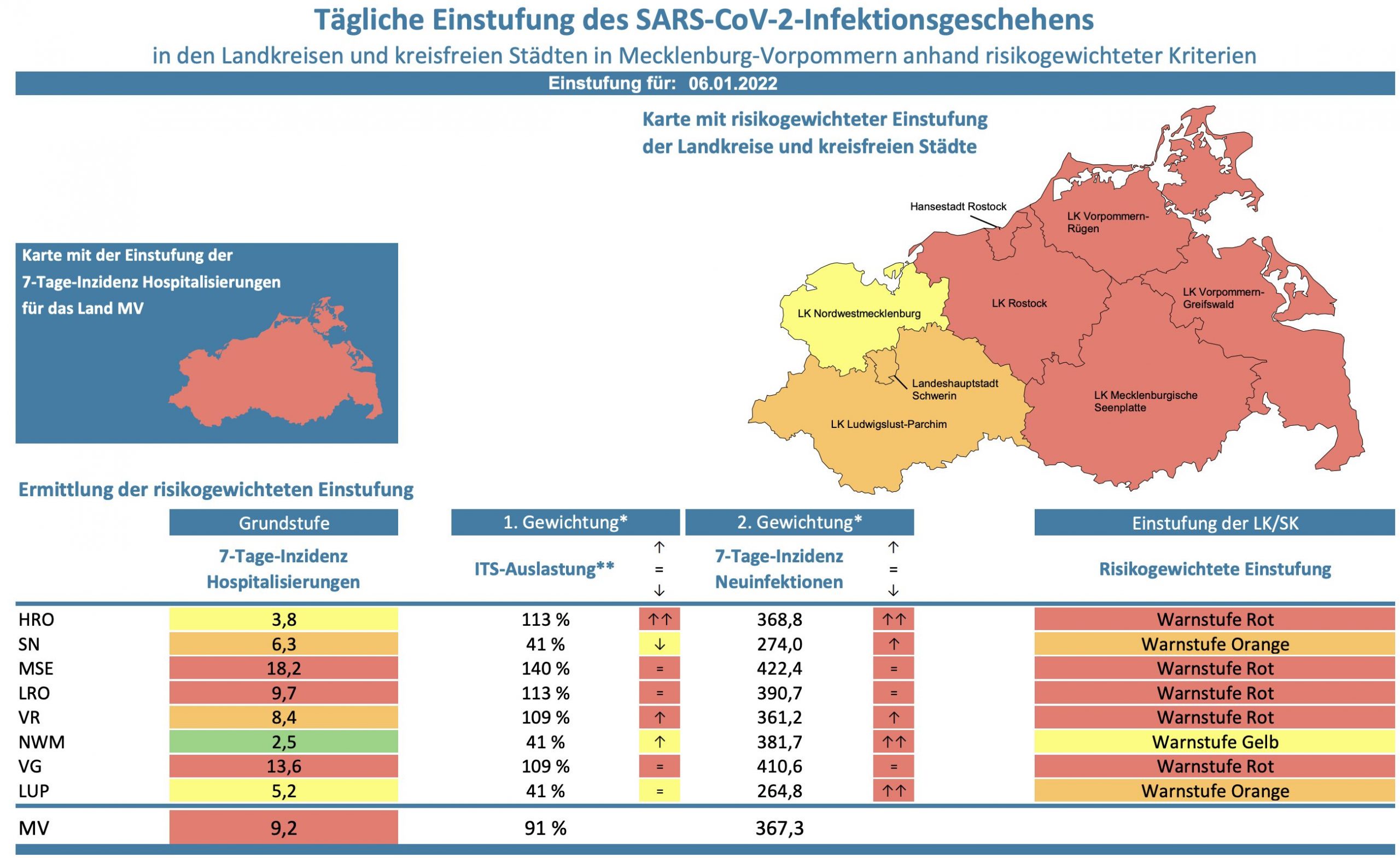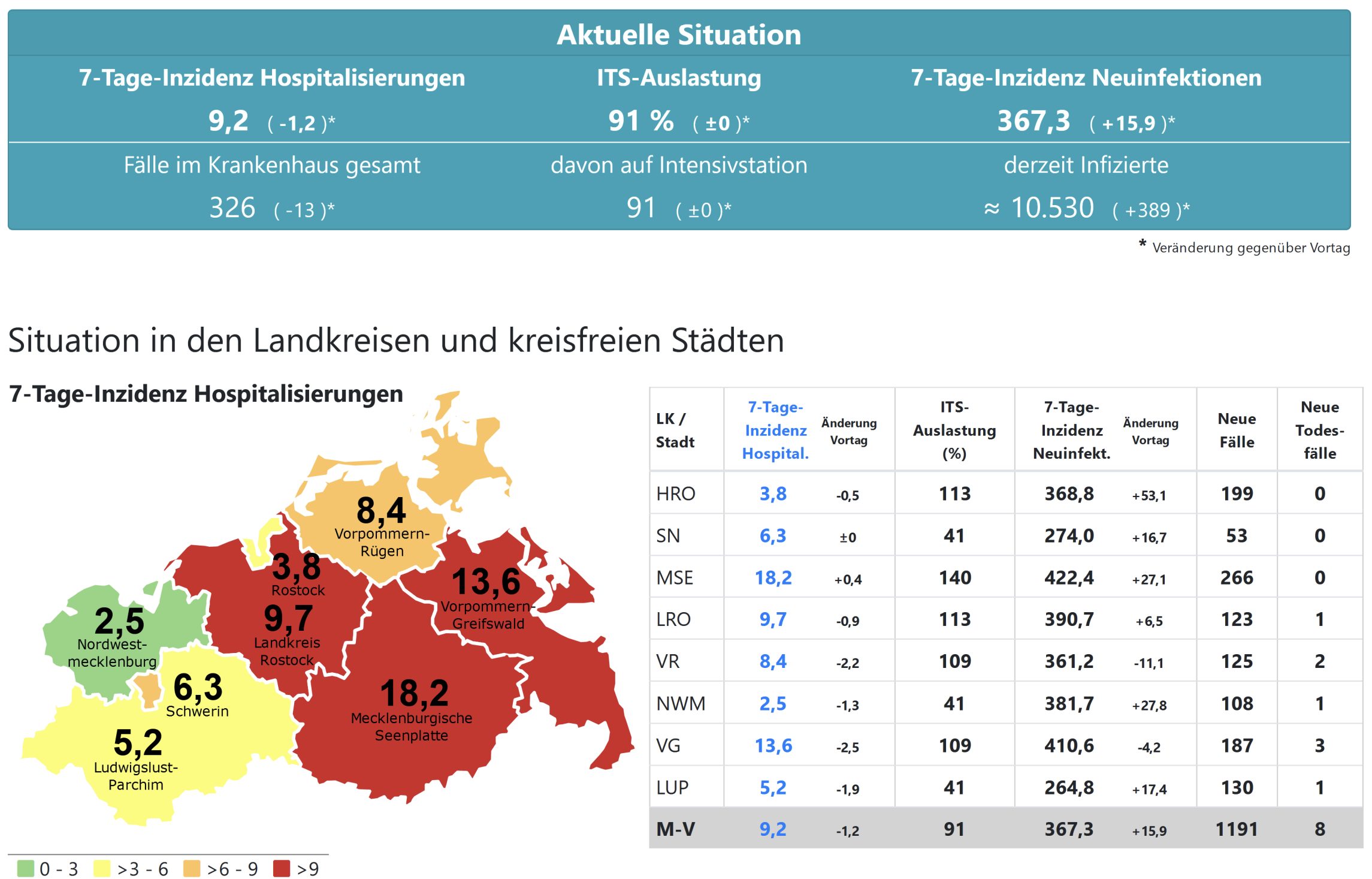 Die Hospitalisierung in ganz Mecklenburg-Vorpommern liegt heute bei 9,2, die Inzidenz des Landes steigt von 352,2 auf 367,3. Das Land Mecklenburg-Vorpommern meldet heute 1191 Neuinfektionen und 8 neue Todesfälle.