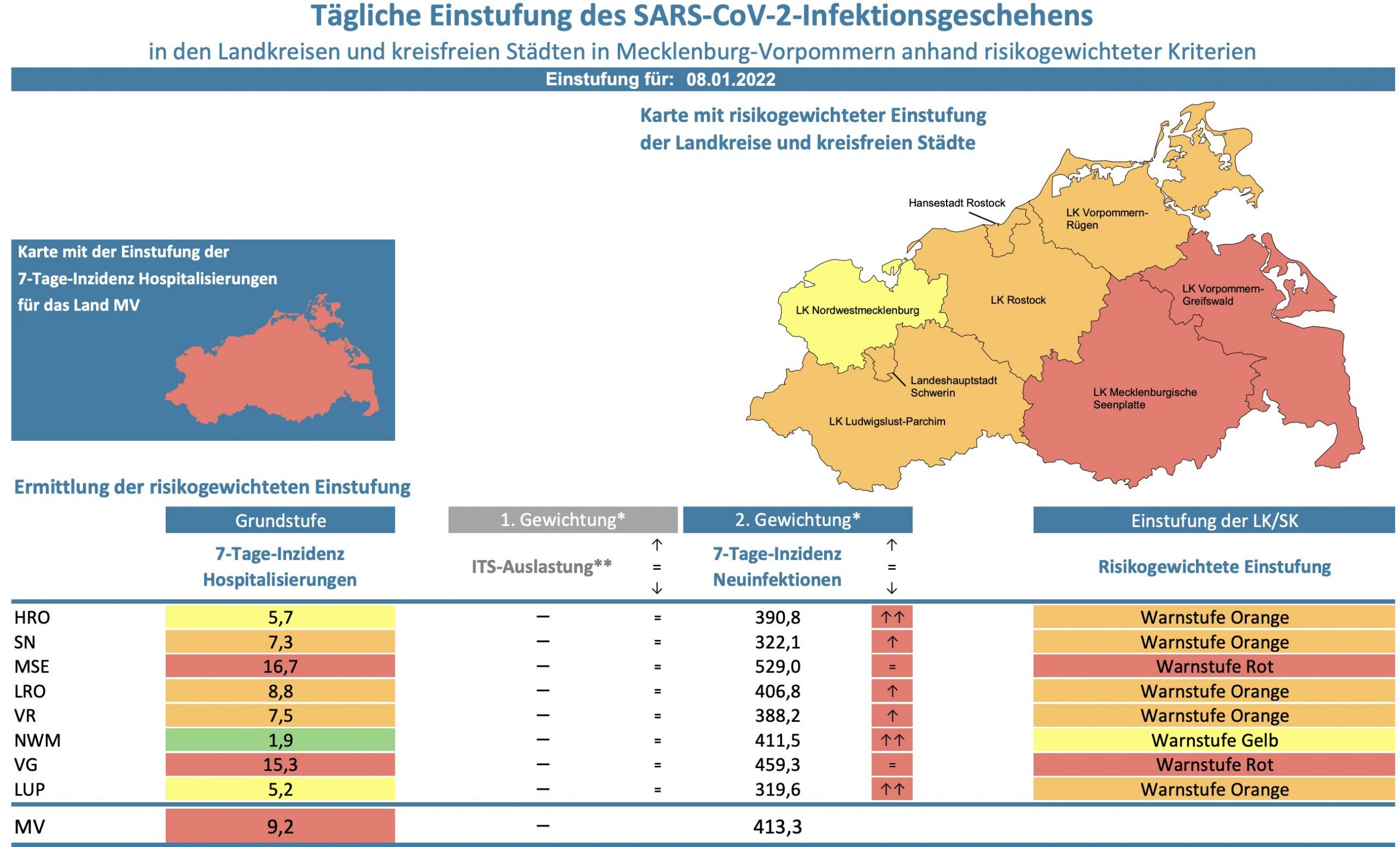 Die Hospitalisierung in ganz Mecklenburg-Vorpommern liegt heute bei 9,2, die Inzidenz des Landes steigt von 389,4 auf 413,3. Das Land Mecklenburg-Vorpommern meldet heute 655 Neuinfektionen und keinen neuen Todesfall.