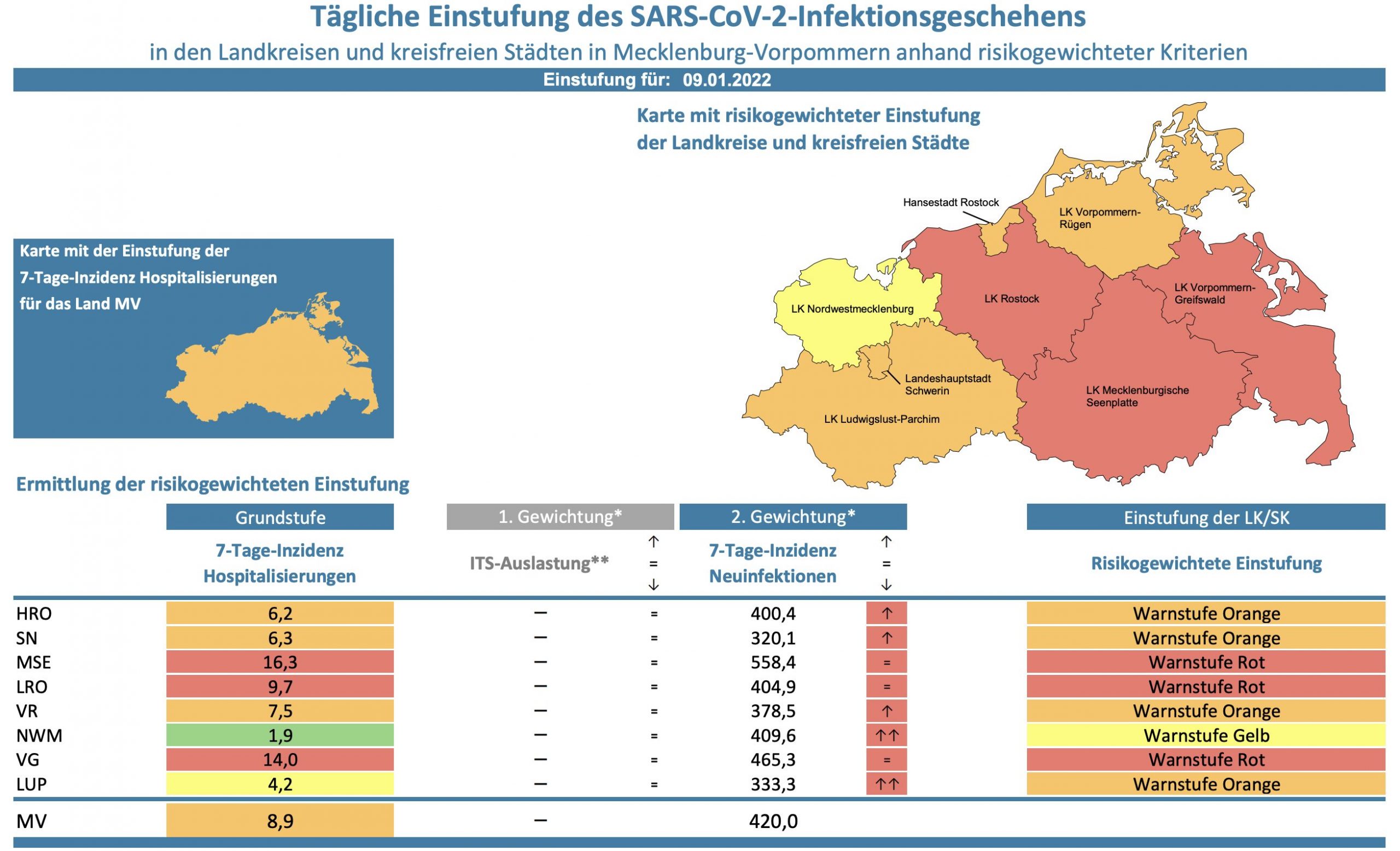 Die Hospitalisierung in ganz Mecklenburg-Vorpommern liegt heute bei 8,9, die Inzidenz des Landes steigt von 413,3 auf 420,0. Das Land Mecklenburg-Vorpommern meldet heute 392 Neuinfektionen und keinen neuen Todesfall.