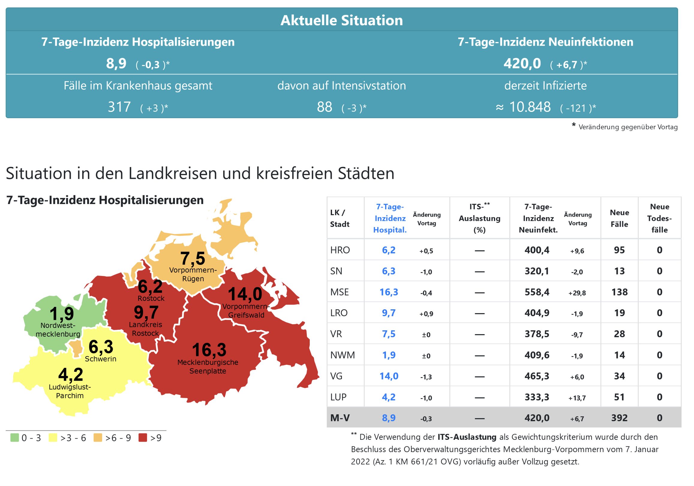 Die Hospitalisierung in ganz Mecklenburg-Vorpommern liegt heute bei 8,9, die Inzidenz des Landes steigt von 413,3 auf 420,0. Das Land Mecklenburg-Vorpommern meldet heute 392 Neuinfektionen und keinen neuen Todesfall.