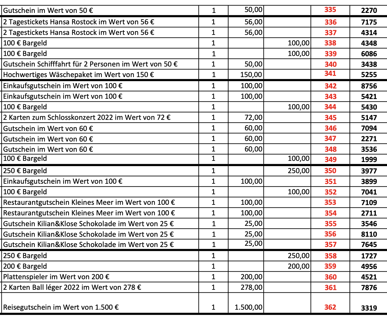 Die Weihnachtslotterie des Lions-Club Müritz und des Rotary-Club Waren ist Geschichte, aber die Gewinne sind noch nicht alle abgeholt. Auf vielfachen Leser-Wunsch veröffentlichen wir hier noch einmal alle Gewinnzahlen. Die beiden Clubs haben insgesamt 162 Gewinne im Gesamtwert von über 18 000 Euro verlost, der Erlös aus dem Verkauf der 8000 Kalender geht an verschiedene Kinder- und Jugendprojekte an der Müritz.